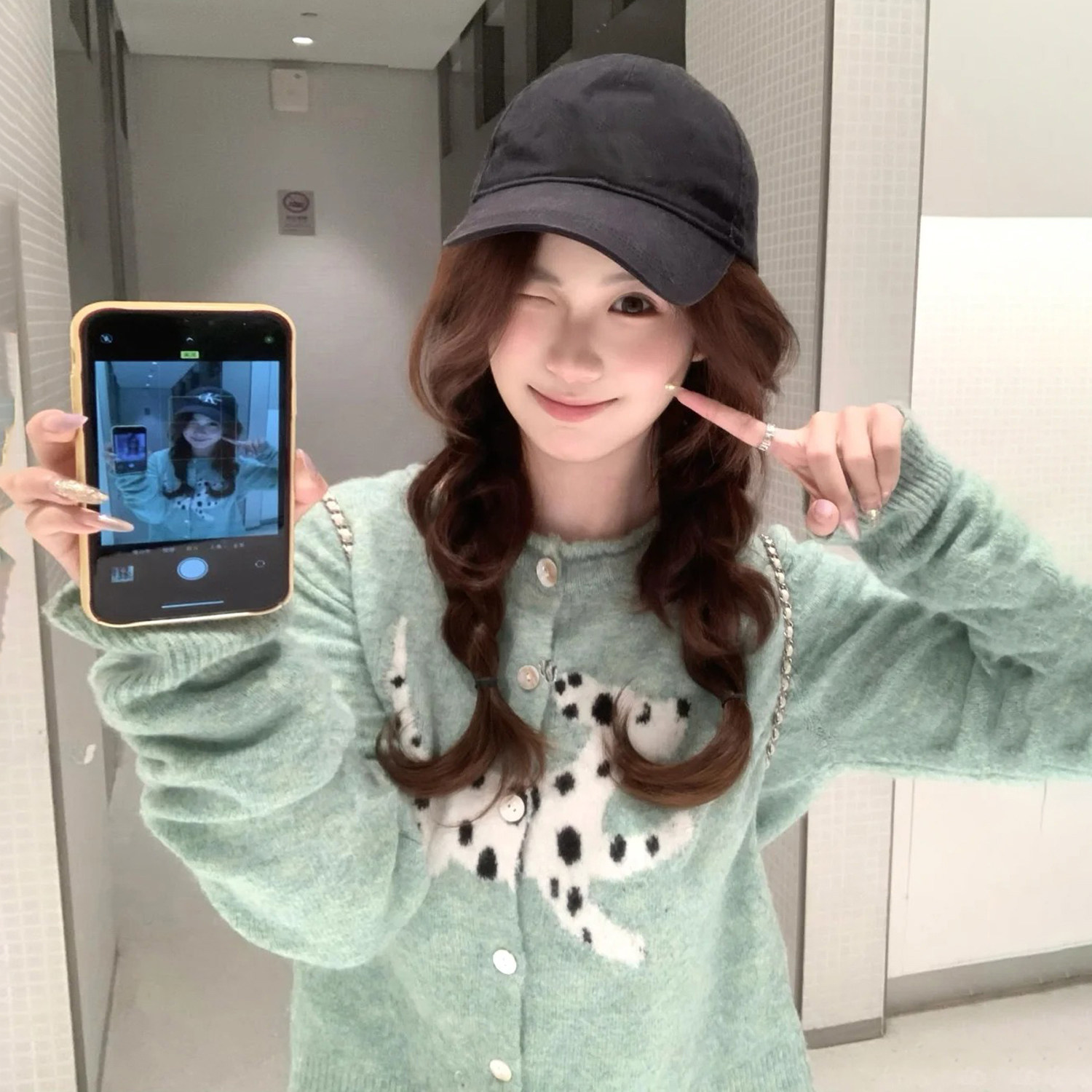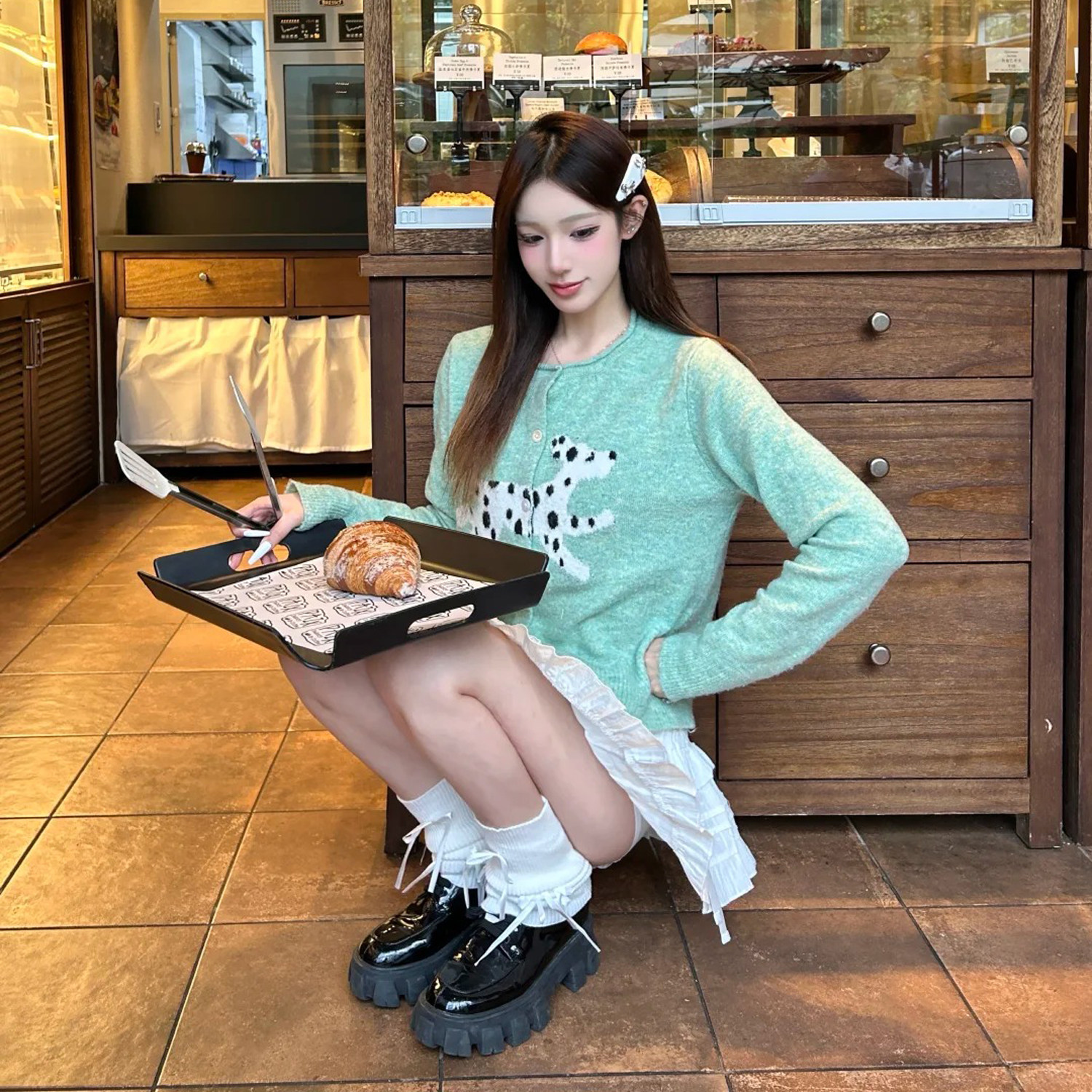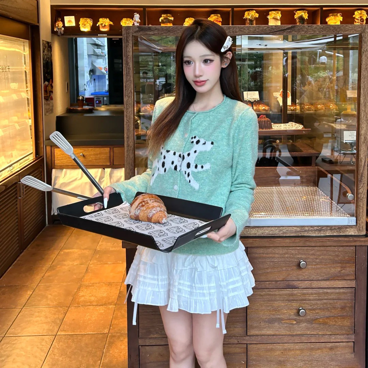 首页> 女装> 2026春季韩系提花绿色小狗卡通长袖正肩毛衣外套慵懒软糯针织开衫