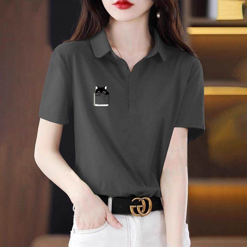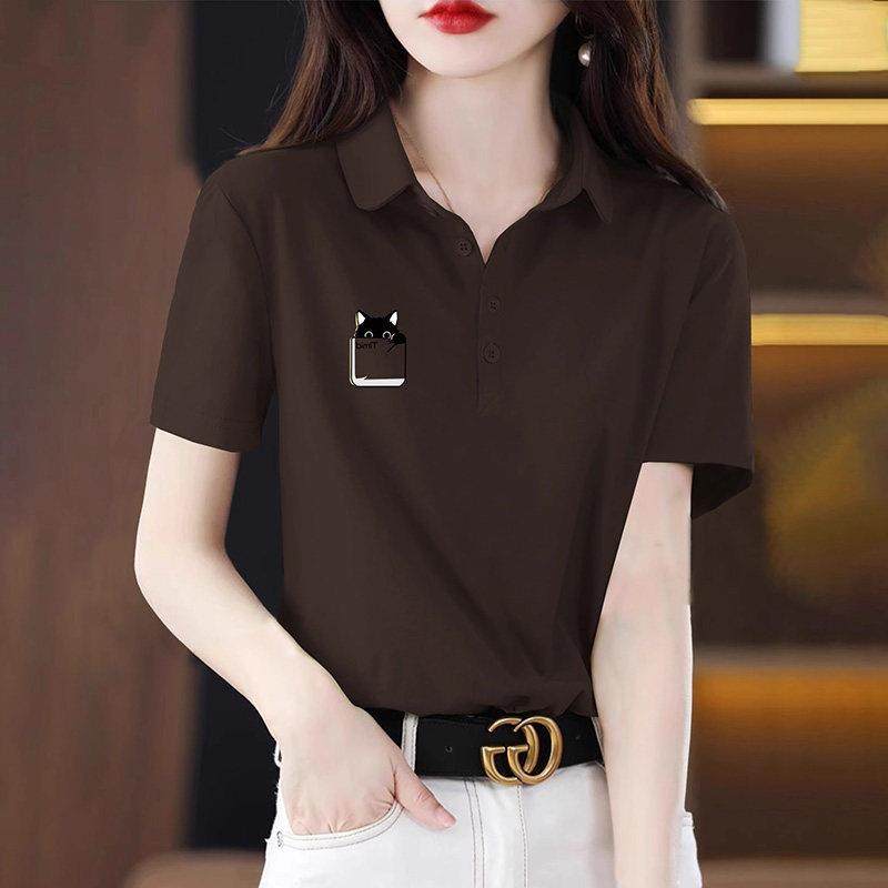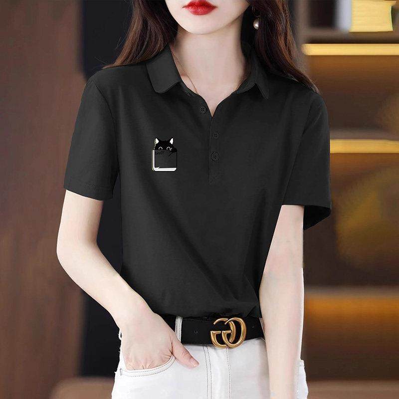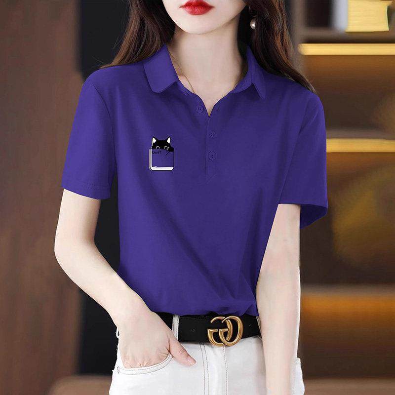 首页> 女装> 酒红色印花短袖T恤女2025夏季大尺码POLO翻领宽松显瘦纯棉内搭上