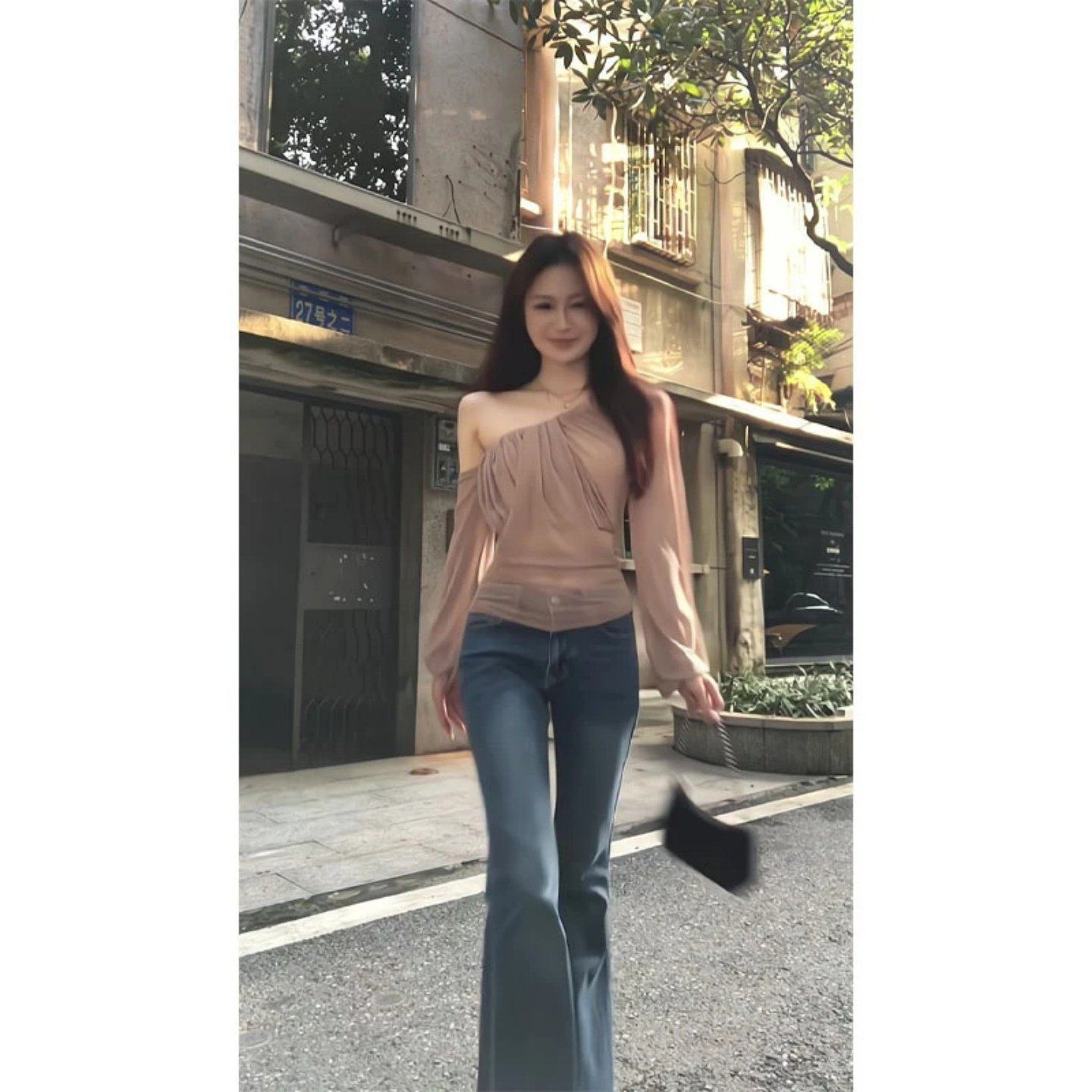2026巨好看搭配一整套纯欲风斜肩网纱长袖上衣高腰显瘦微喇牛仔裤