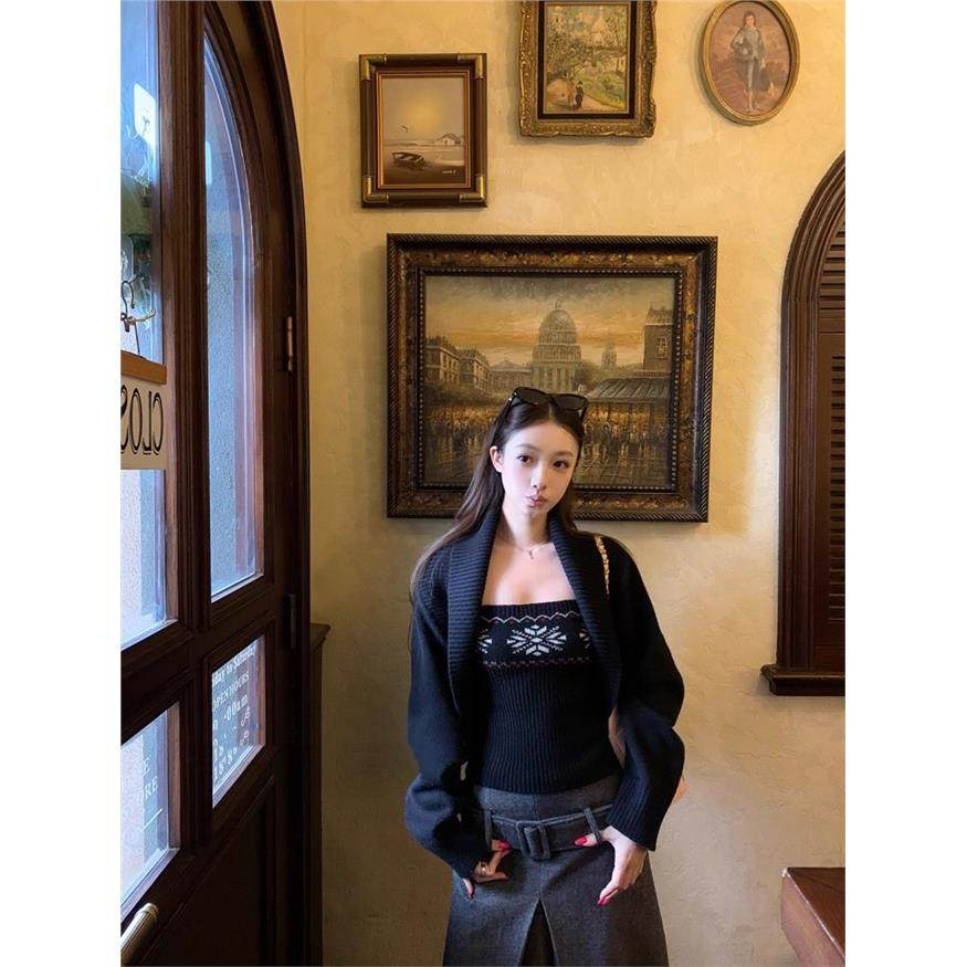费尔岛坎肩毛衣外套女秋冬短款开衫上衣针织抹胸吊带背心两件套装