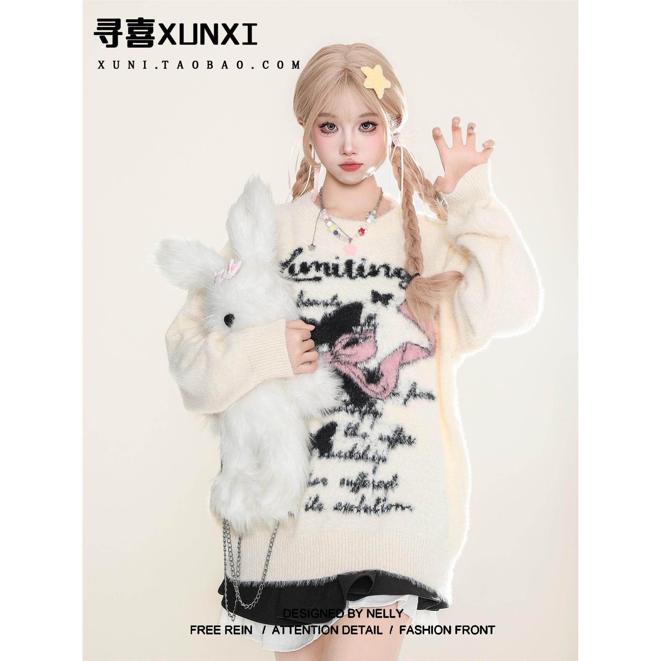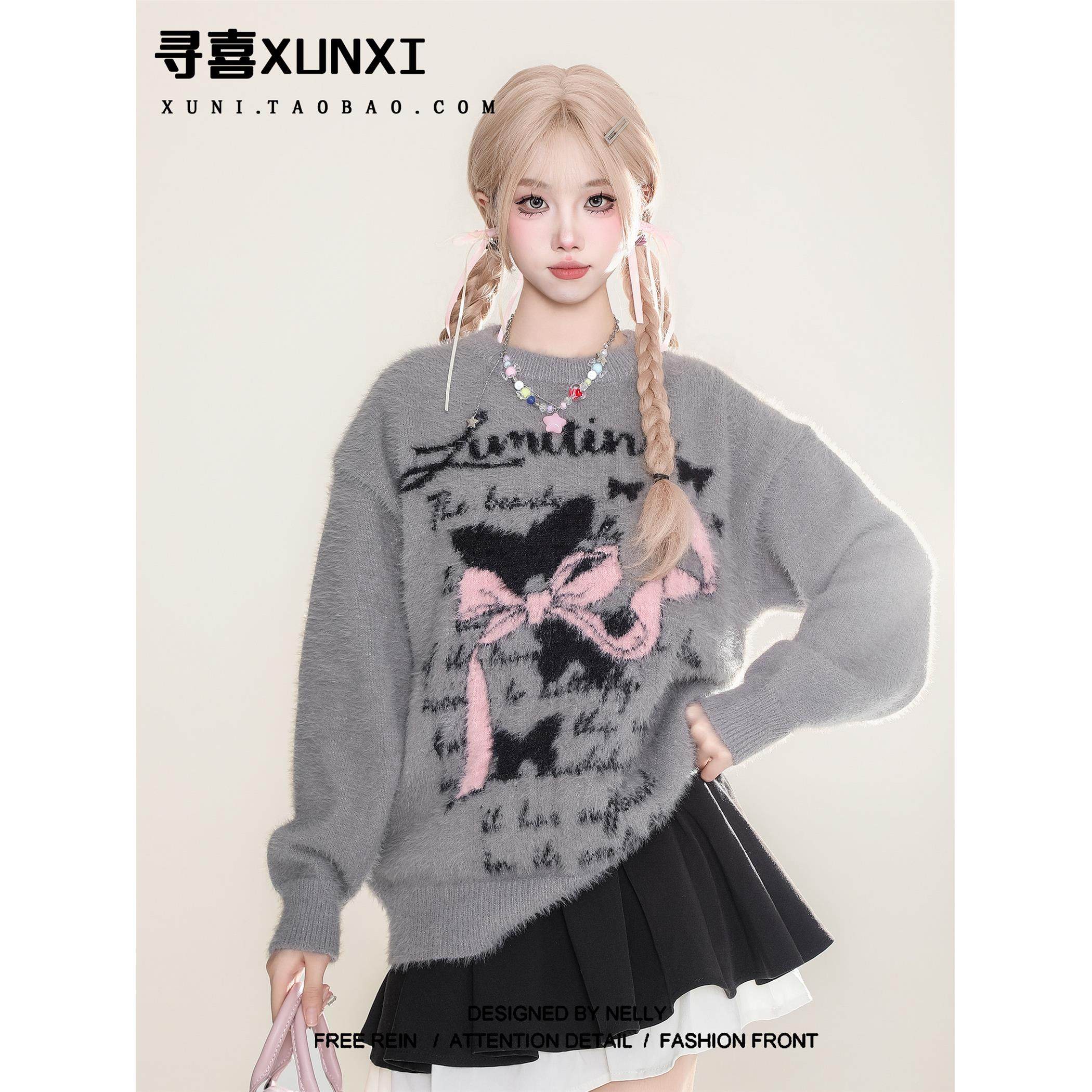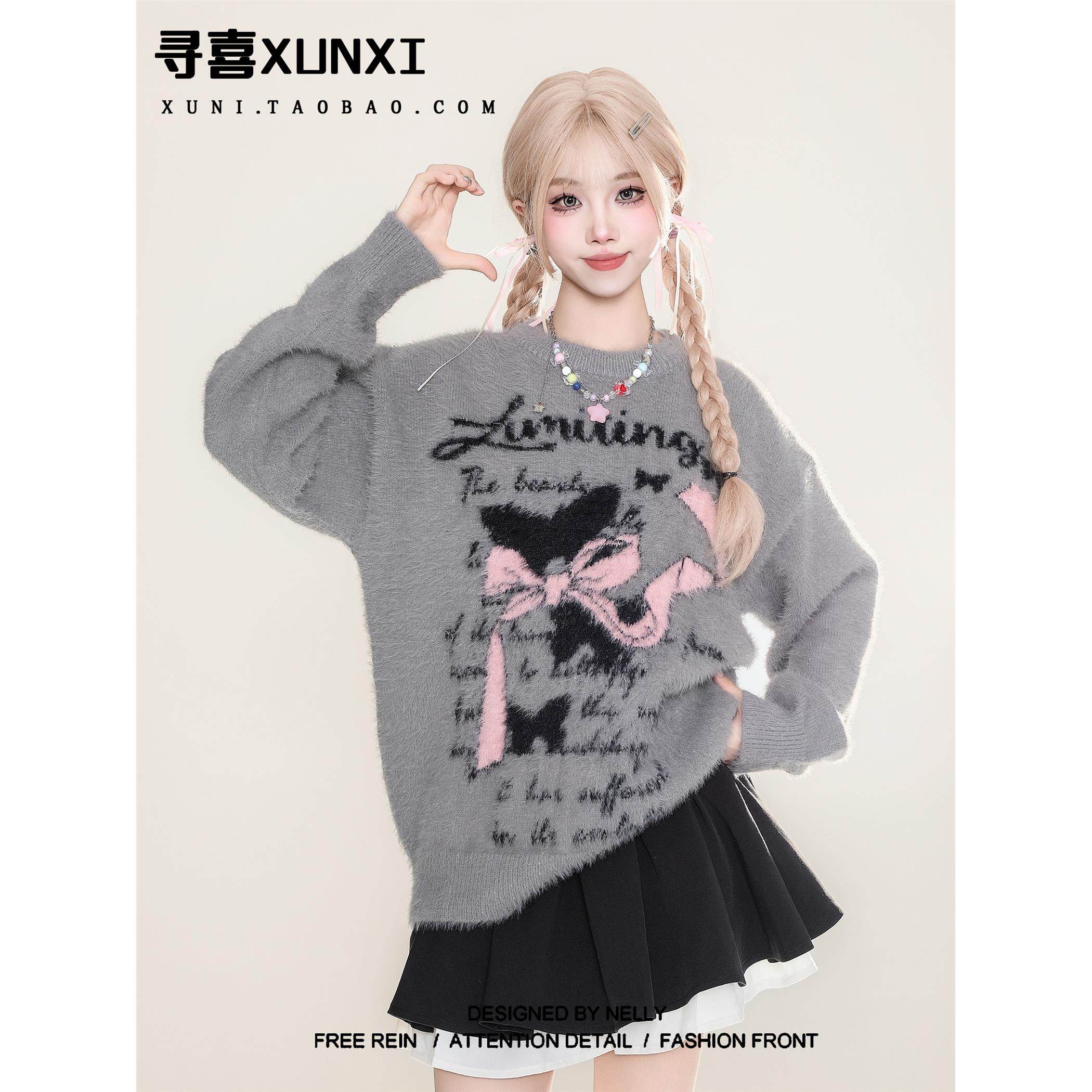 寻喜XUNXI 马海毛甜美针织衫毛衣女秋冬韩系慵懒软糯水貂绒上衣