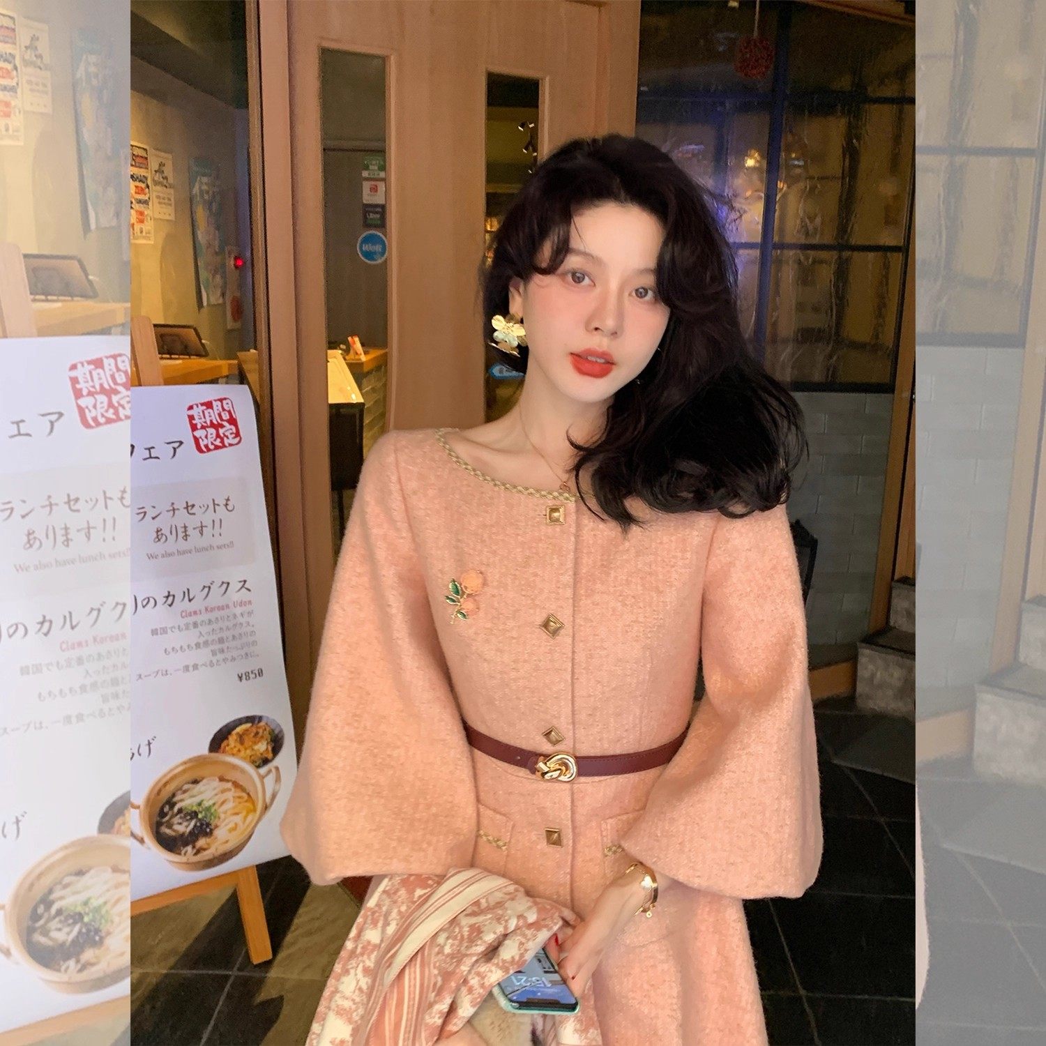 双C腰金丝编织收腰羊毛大衣赫本风裙摆式外套女冬