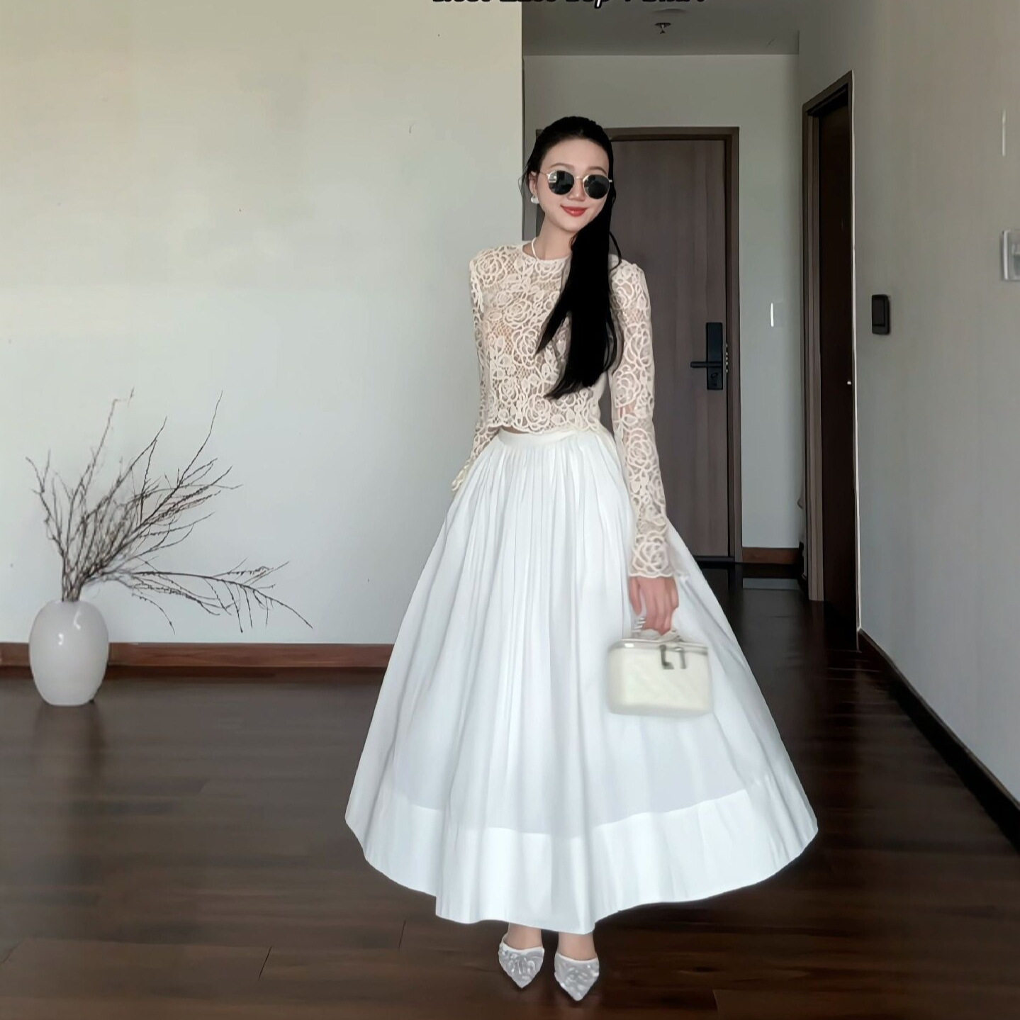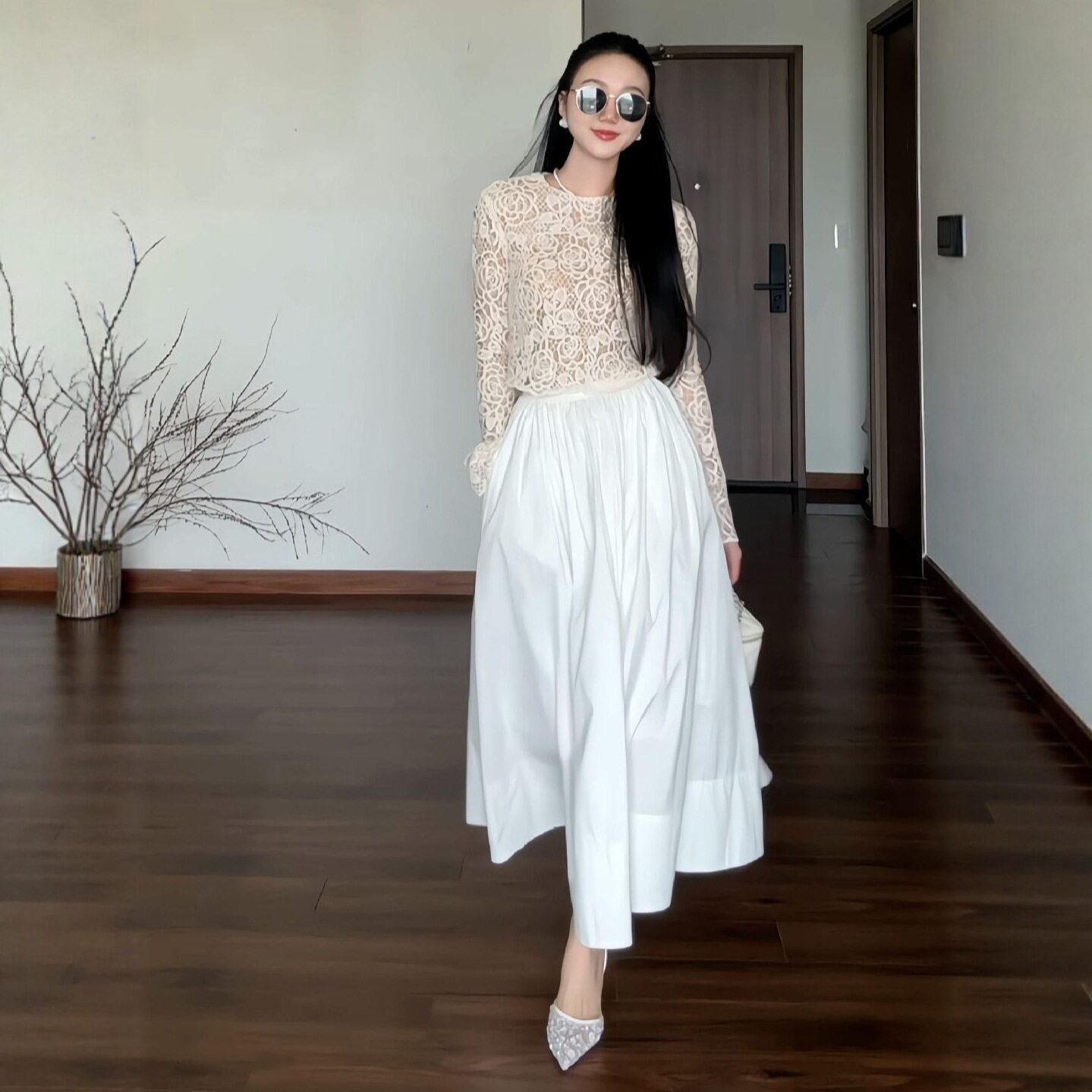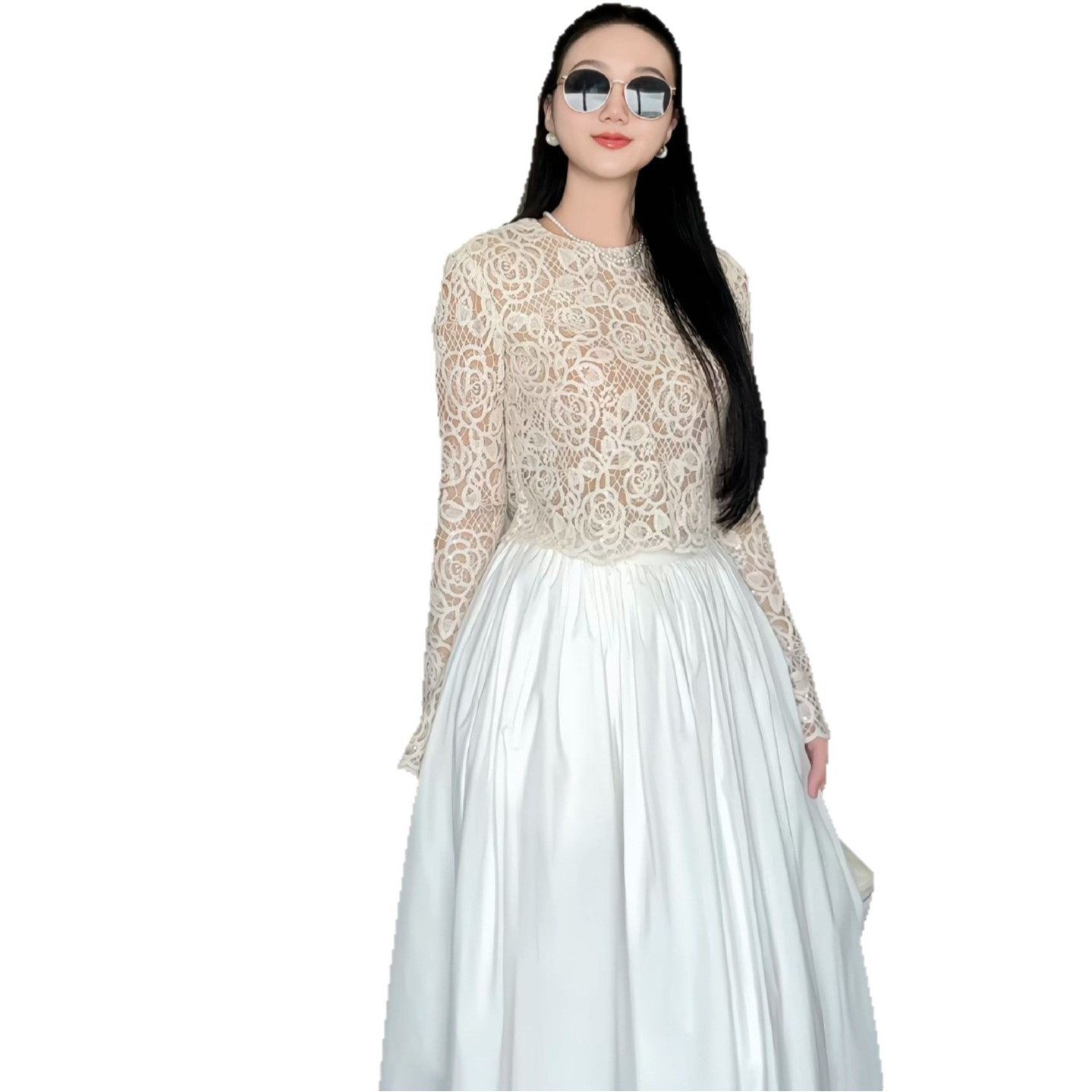2026春季新款女装时尚性感圆领蕾丝长袖白色伞裙套装通勤气质高雅