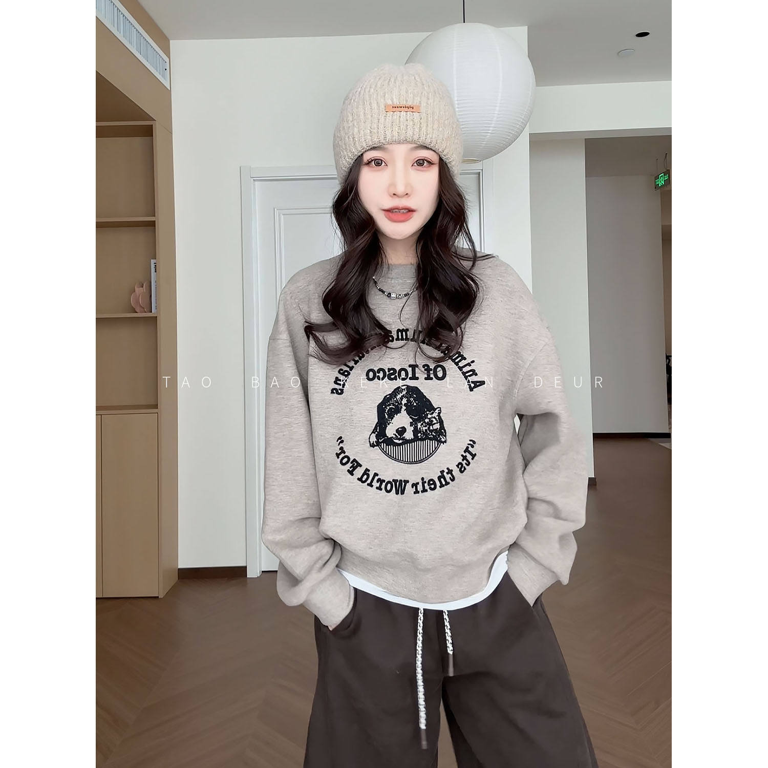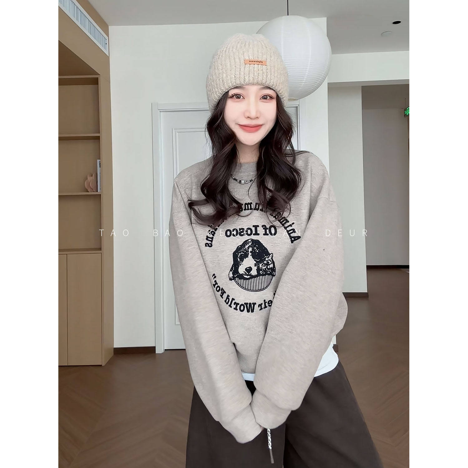KEKE【奶泡星球】不加绒韩系显瘦圆领百搭植绒休闲宽松慵懒风卫衣