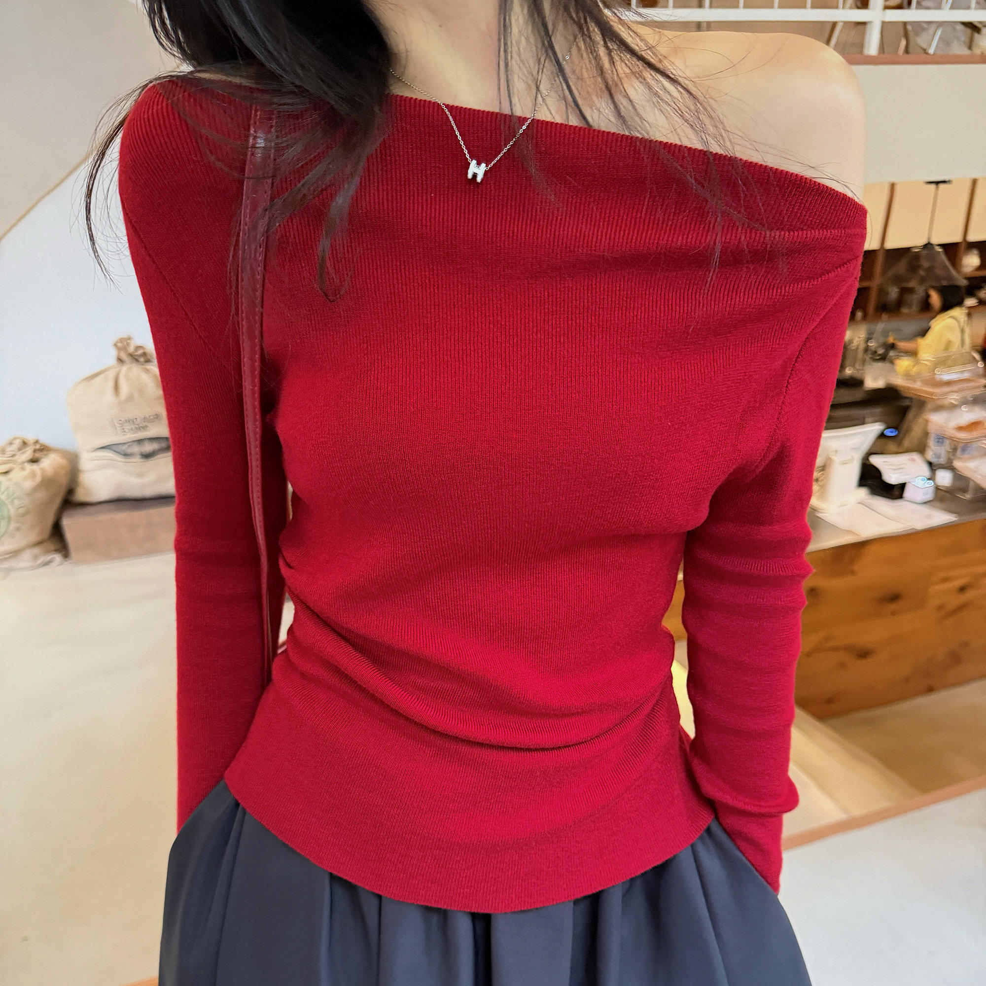 郑chenchen红色一字肩毛衣女秋冬高级感露肩斜肩修身针织长袖上衣