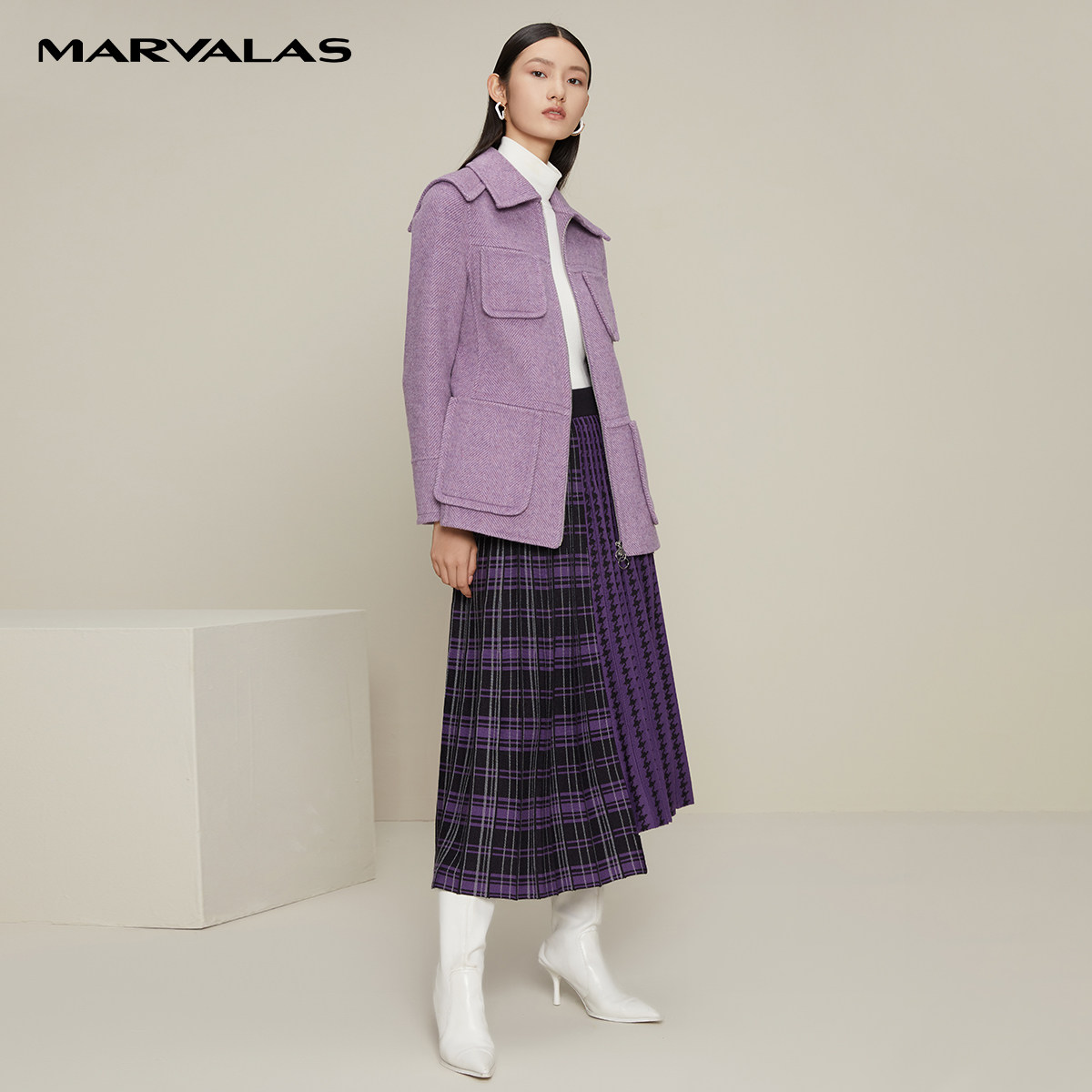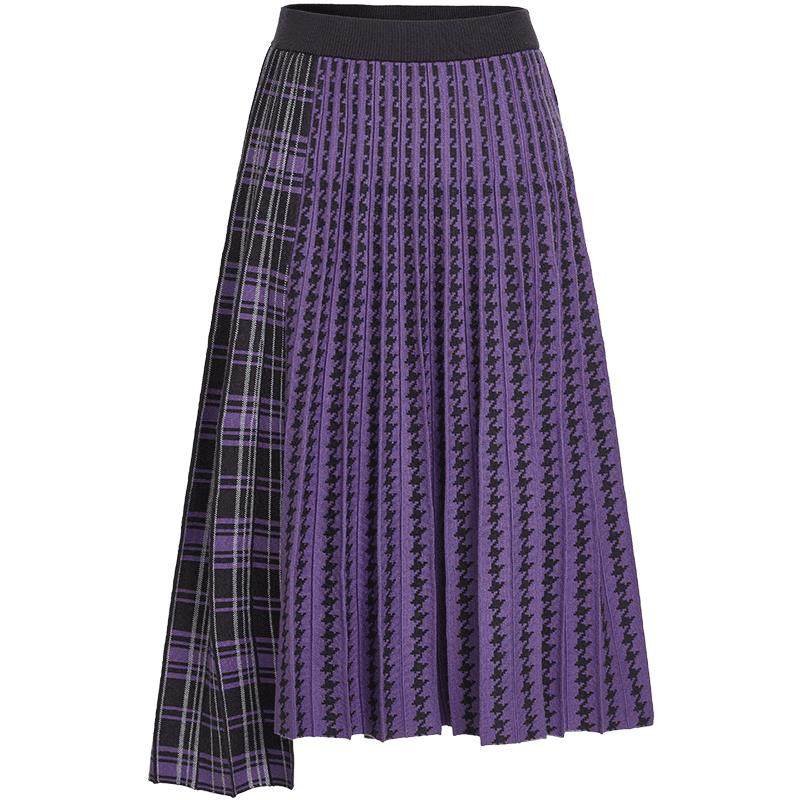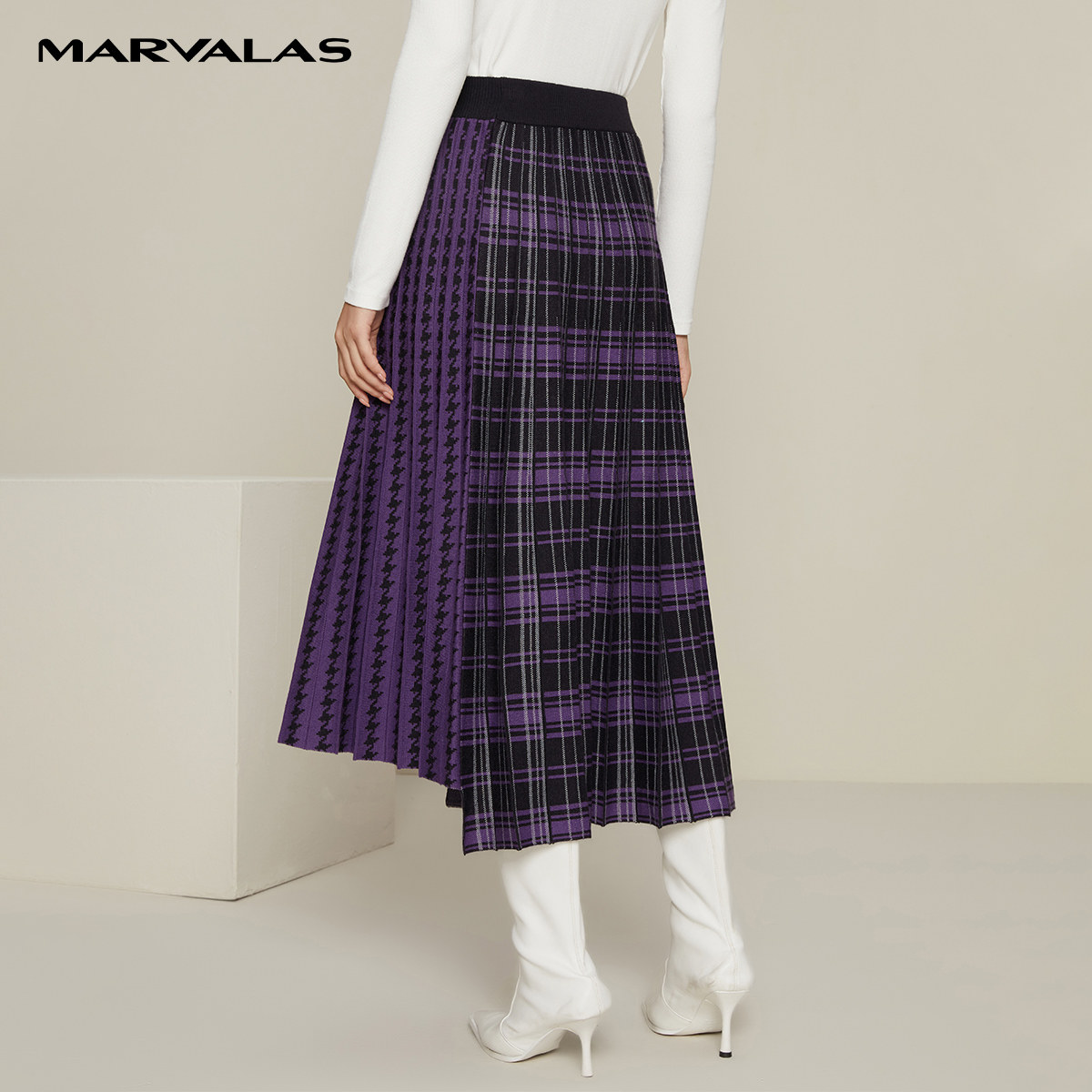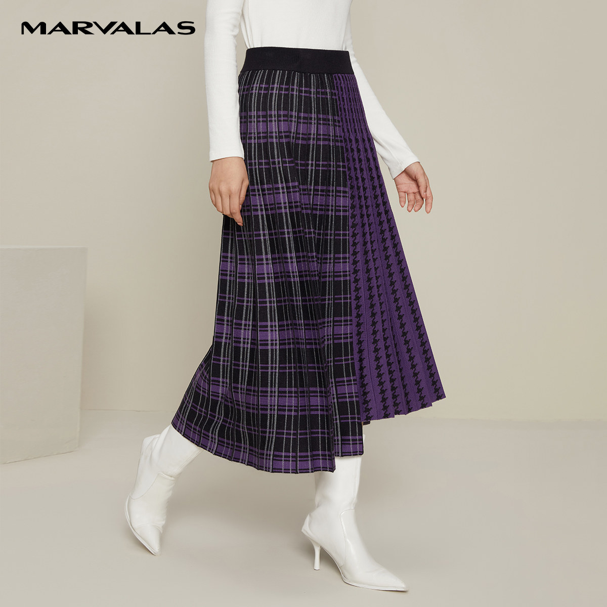 【粉丝专属】M250039曼德诗紫色拼接格纹半身裙女秋冬针织裙