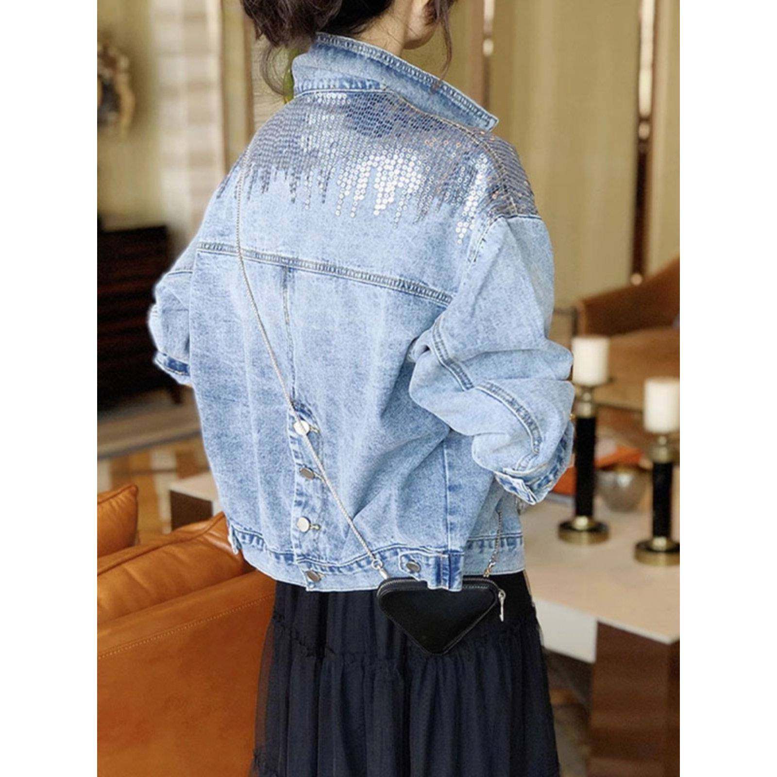 首页> 女装> 欧洲站蓝色亮片牛仔外套女2025年春秋新款时尚港味减龄休闲夹克潮