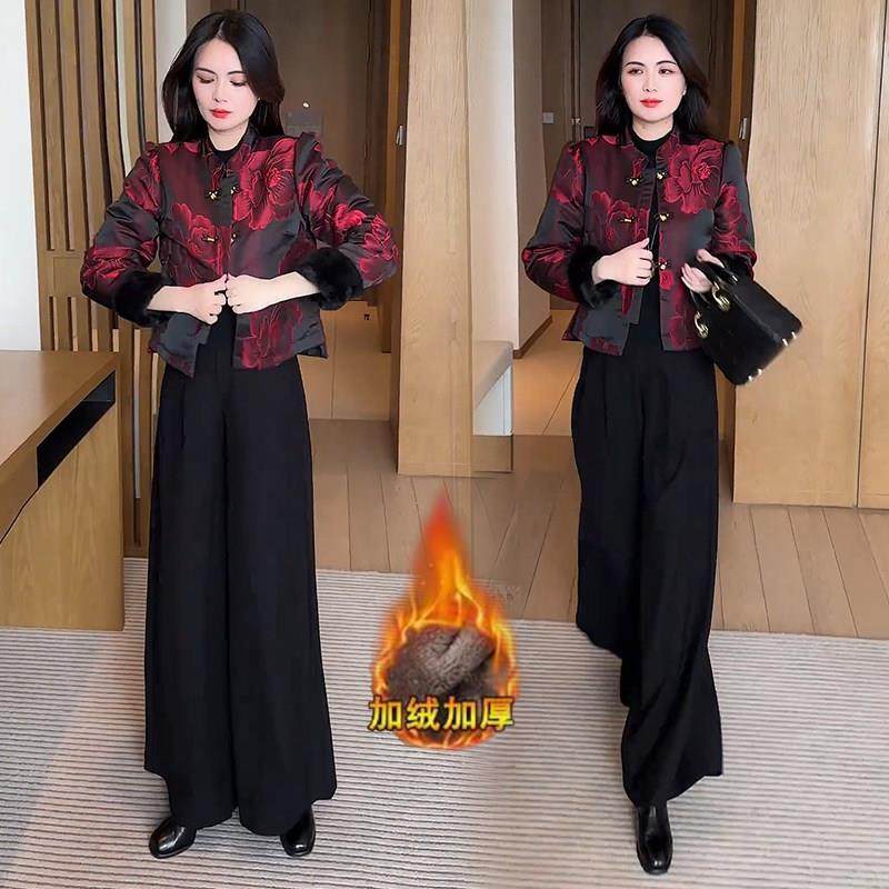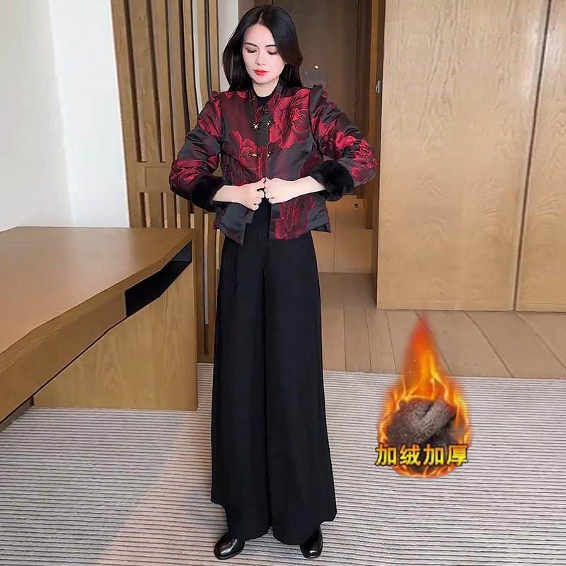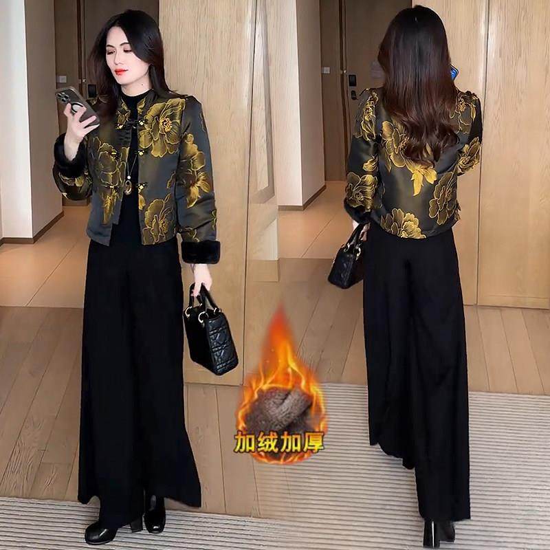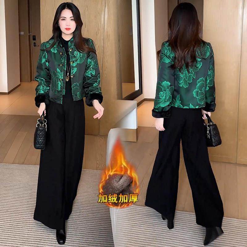 香港代购新中式加绒加厚短款外套女冬季新款显瘦国风提花保暖上衣