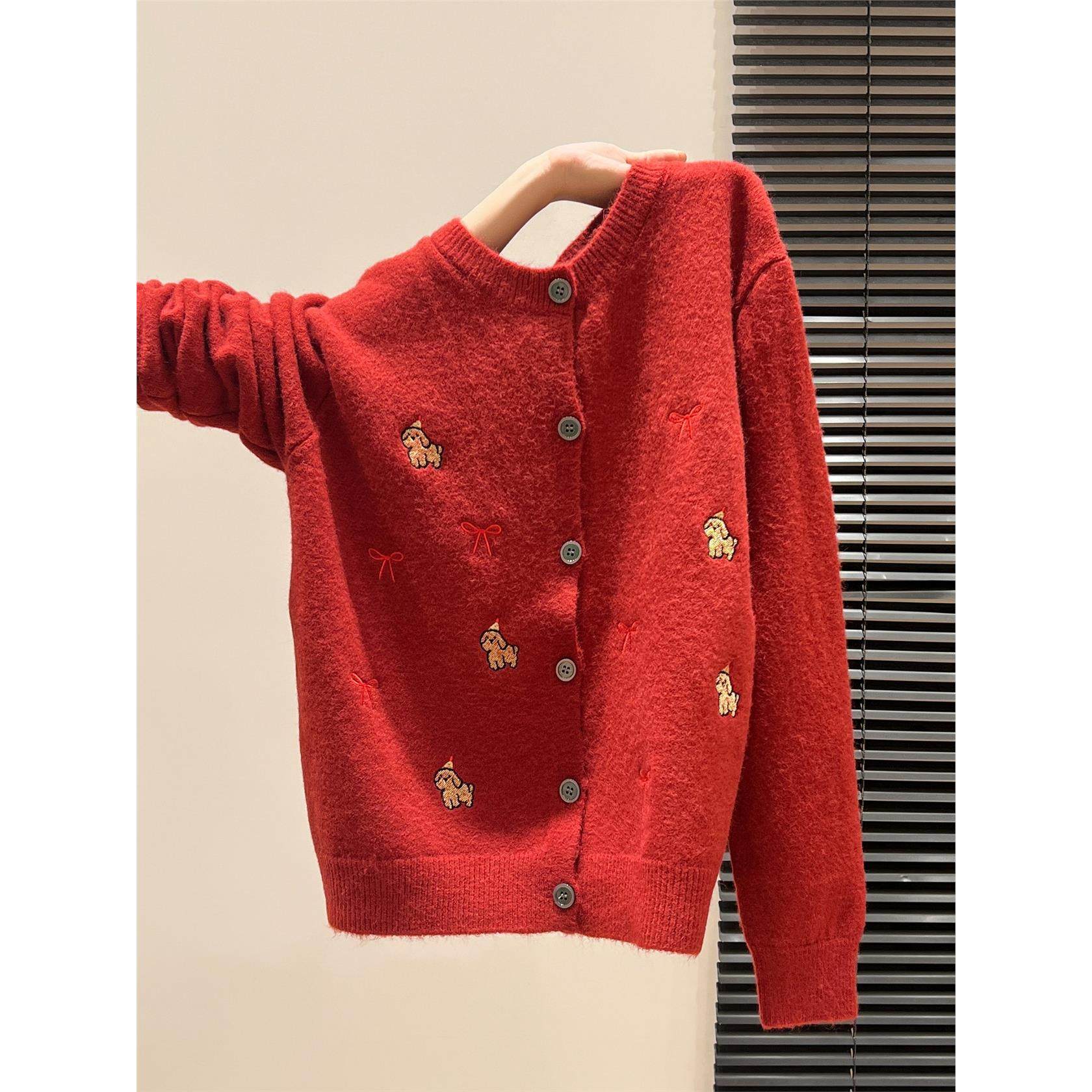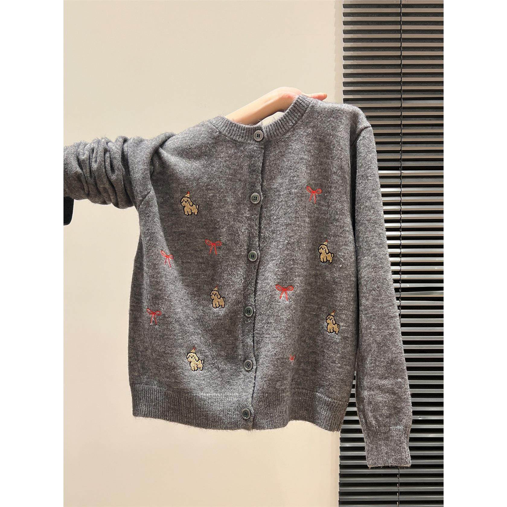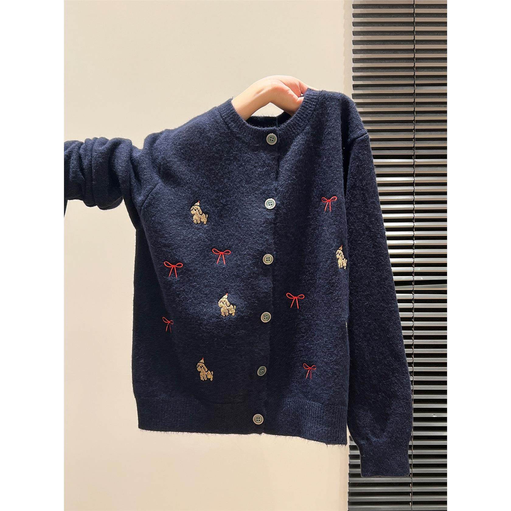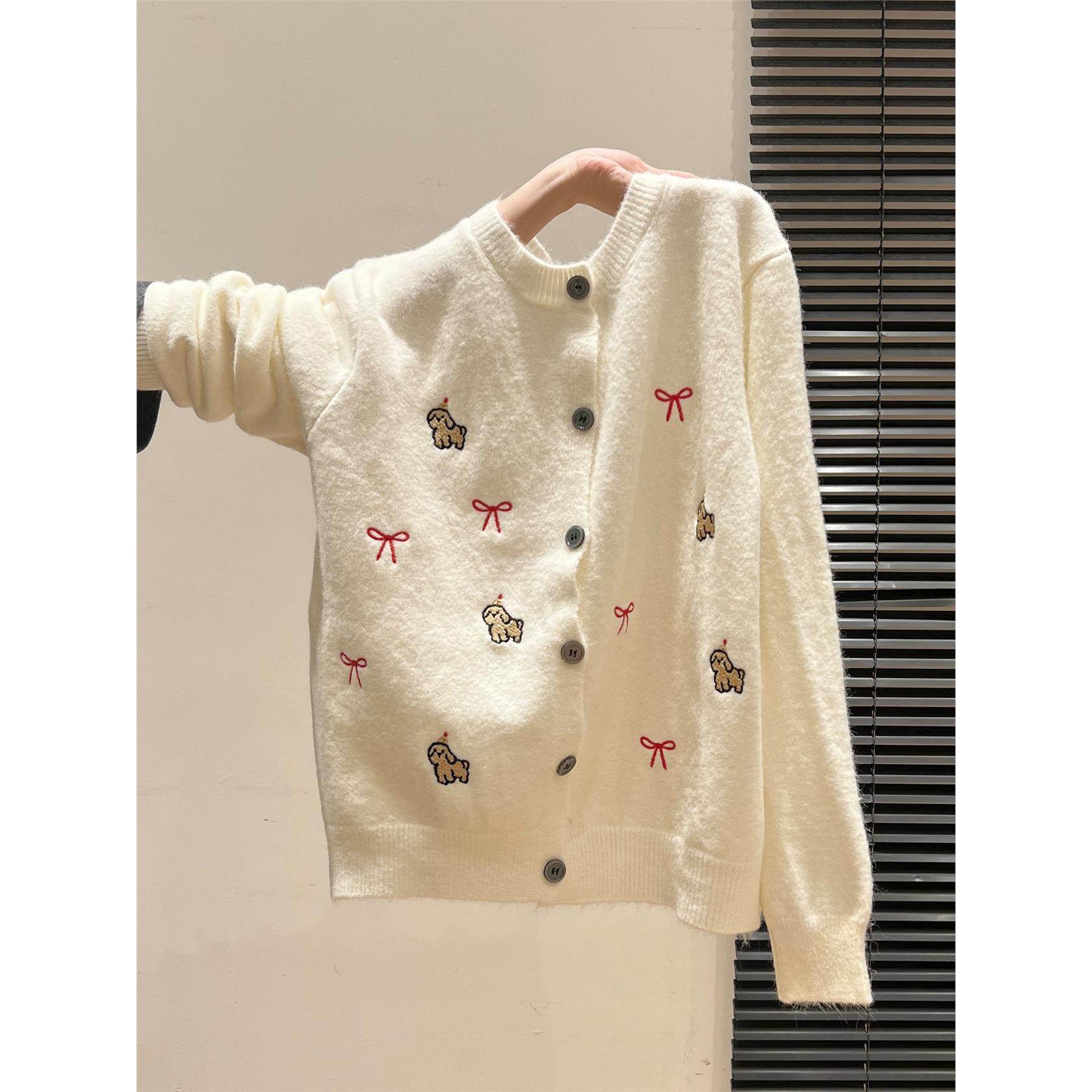 趣味刺绣排扣圆领长袖针织开衫女2025秋冬季新款外搭外套毛衣上衣