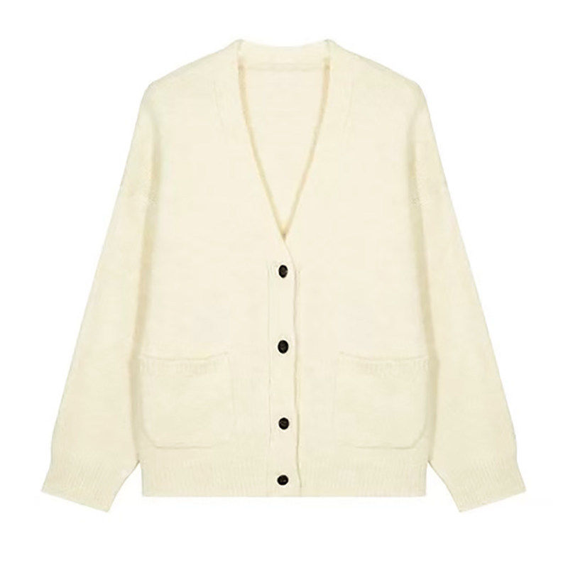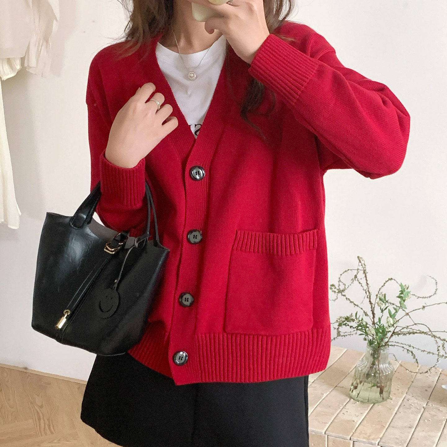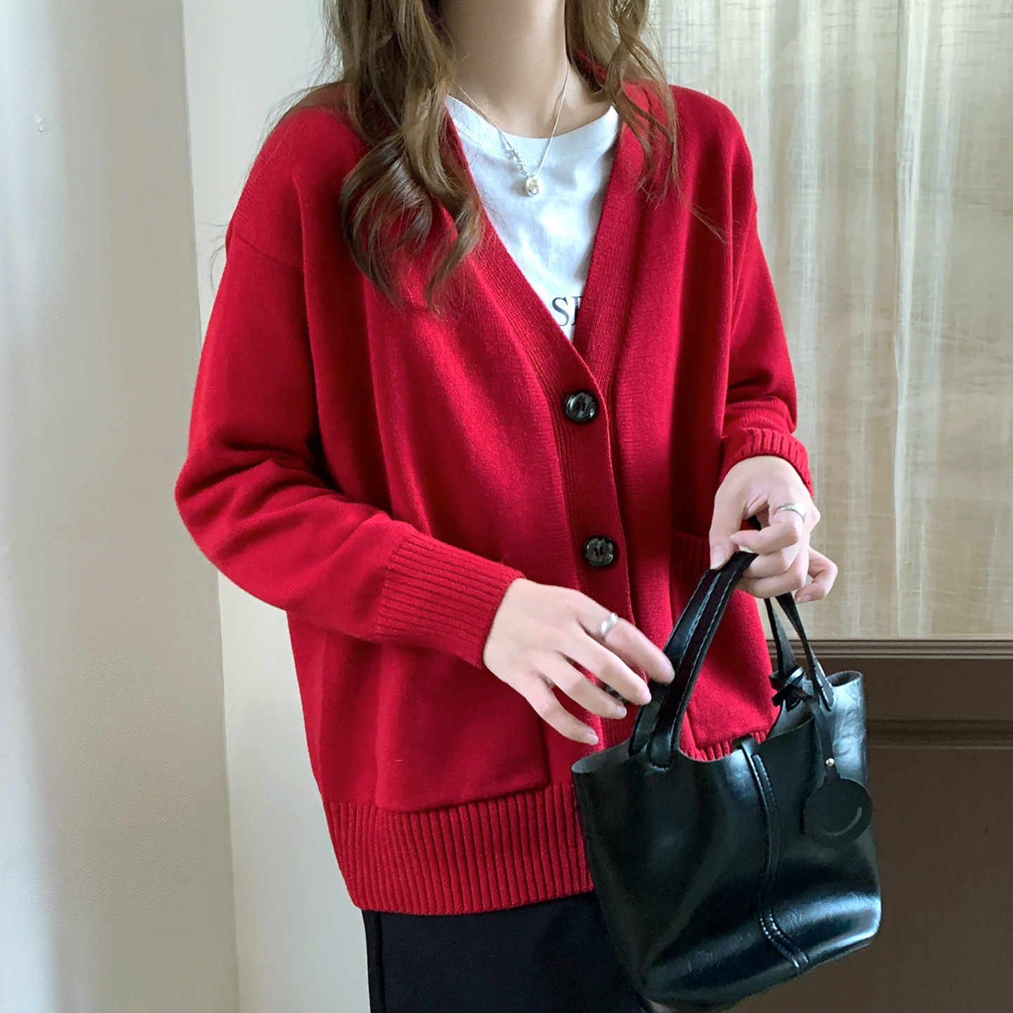 100%棉 纯棉抗起球红色针织开衫女春秋冬宽松高级感简约毛衣外套