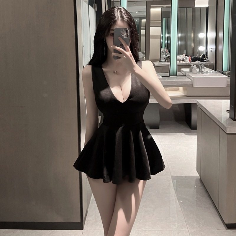 夜店KTV欧美2023跨境外贸性感深V领露背荷叶边收腰无袖蓬蓬短裙