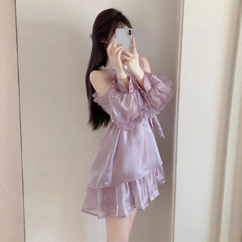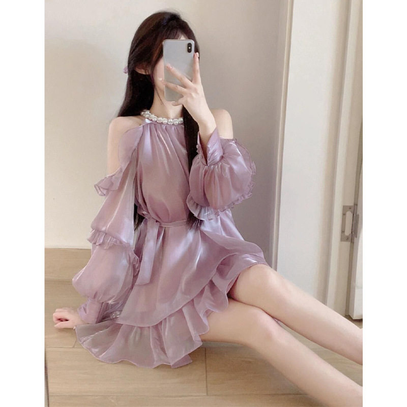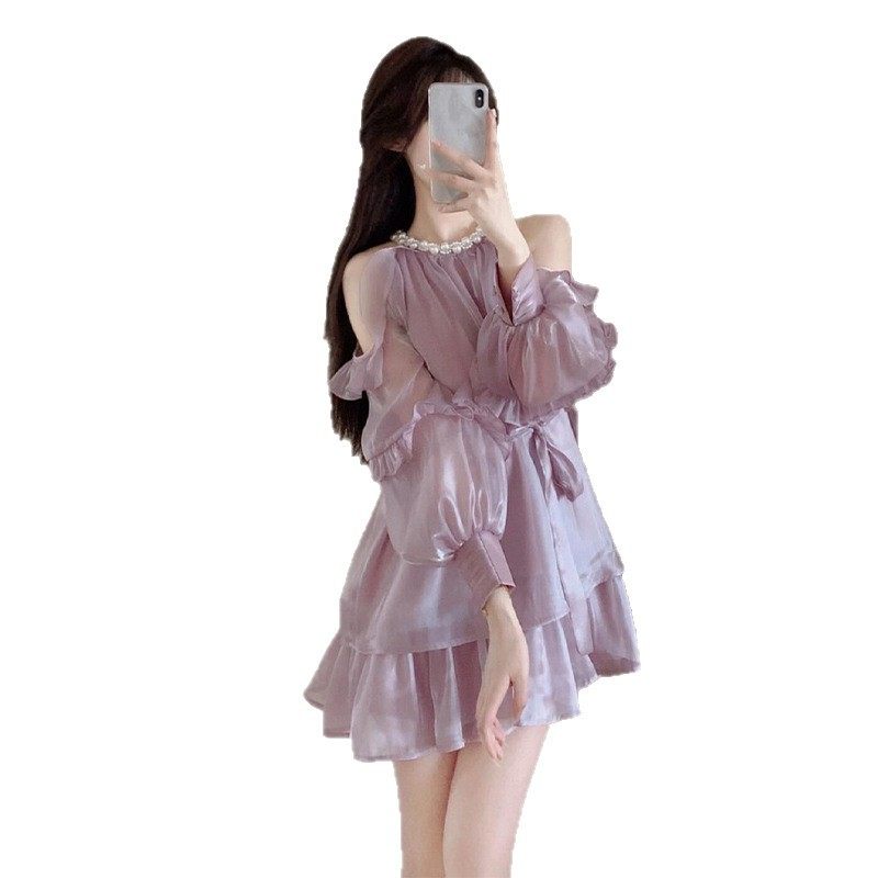 高端精致缎面露肩连衣裙女夏超好看珍珠生日小礼服仙女绝美小裙子