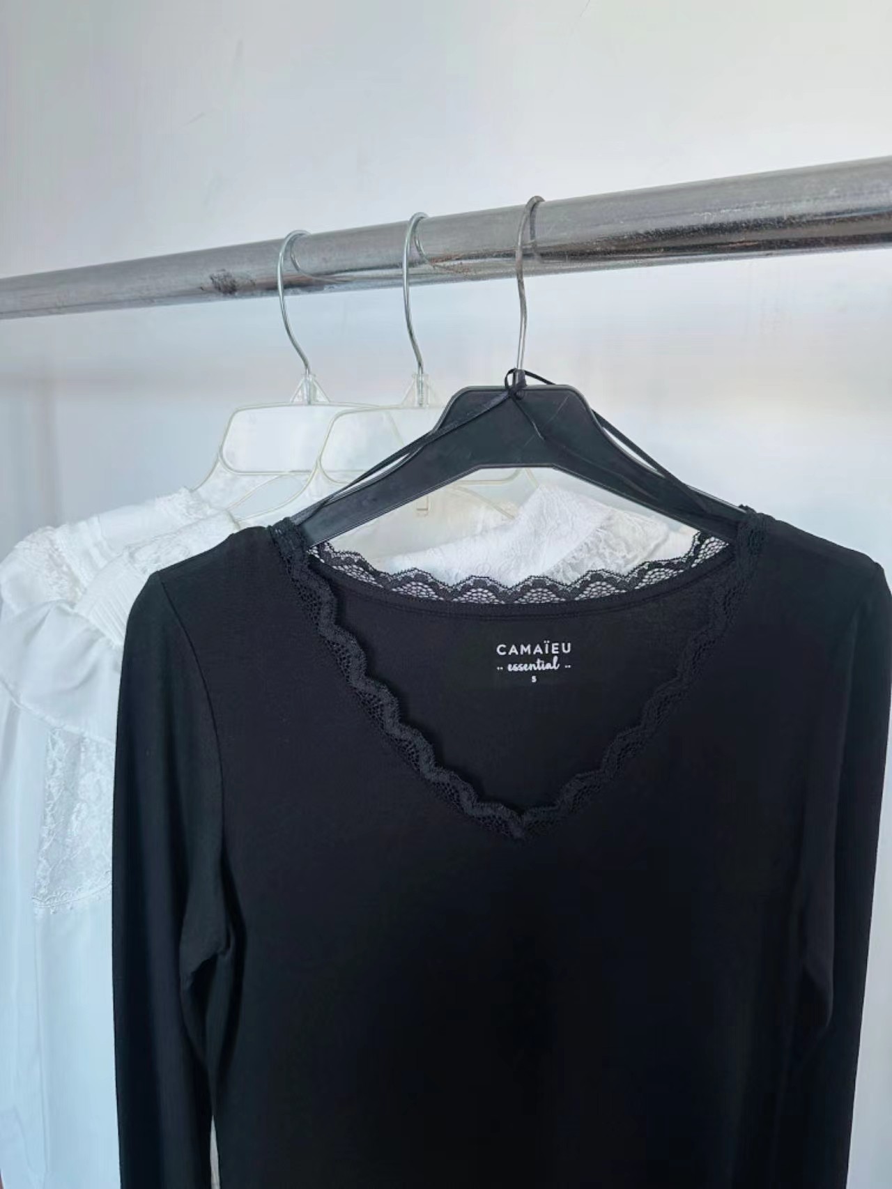 2024春秋定制新款莫代尔蕾丝拼接v领长袖女T恤打底衫修身内搭上衣