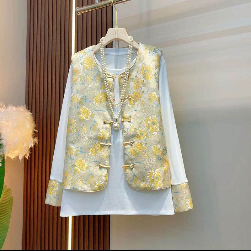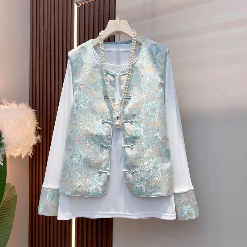 新中式大码女装2025春季款国风韵味提花盘扣马甲打底衫显瘦两件套