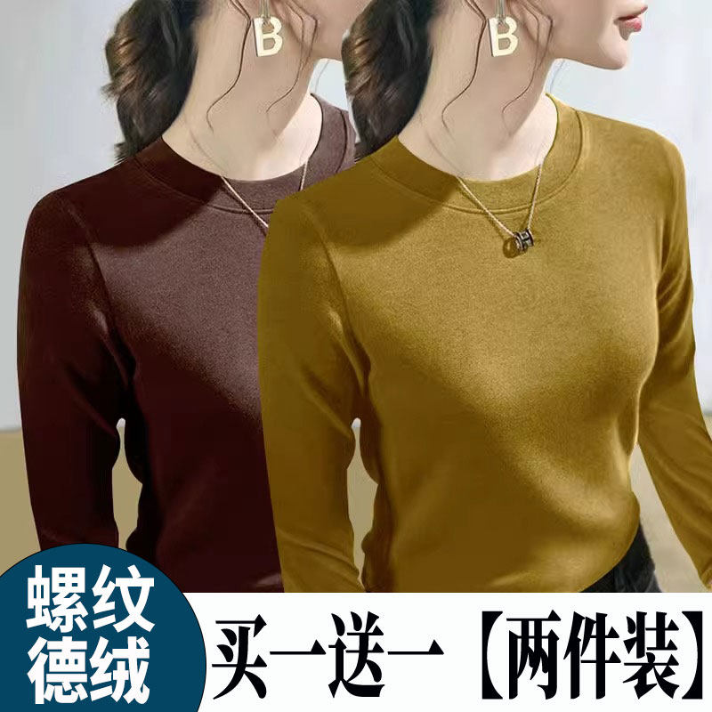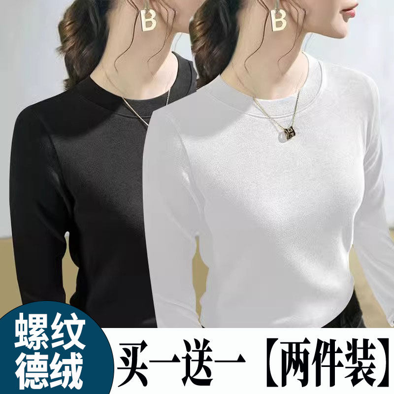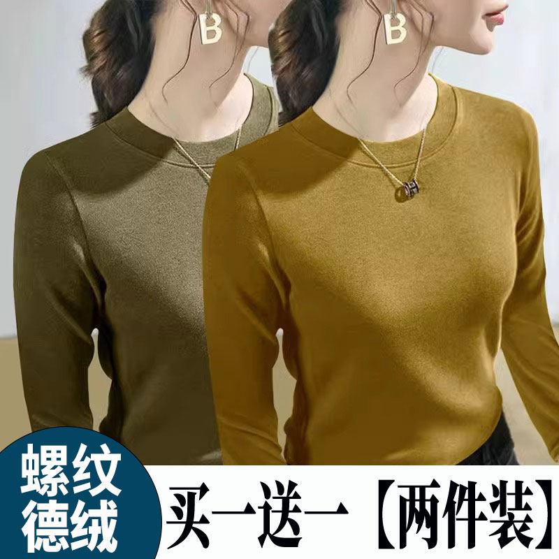 2025新款女秋冬款简约螺纹德绒打底衫女长袖磨毛内搭圆领纯色上衣