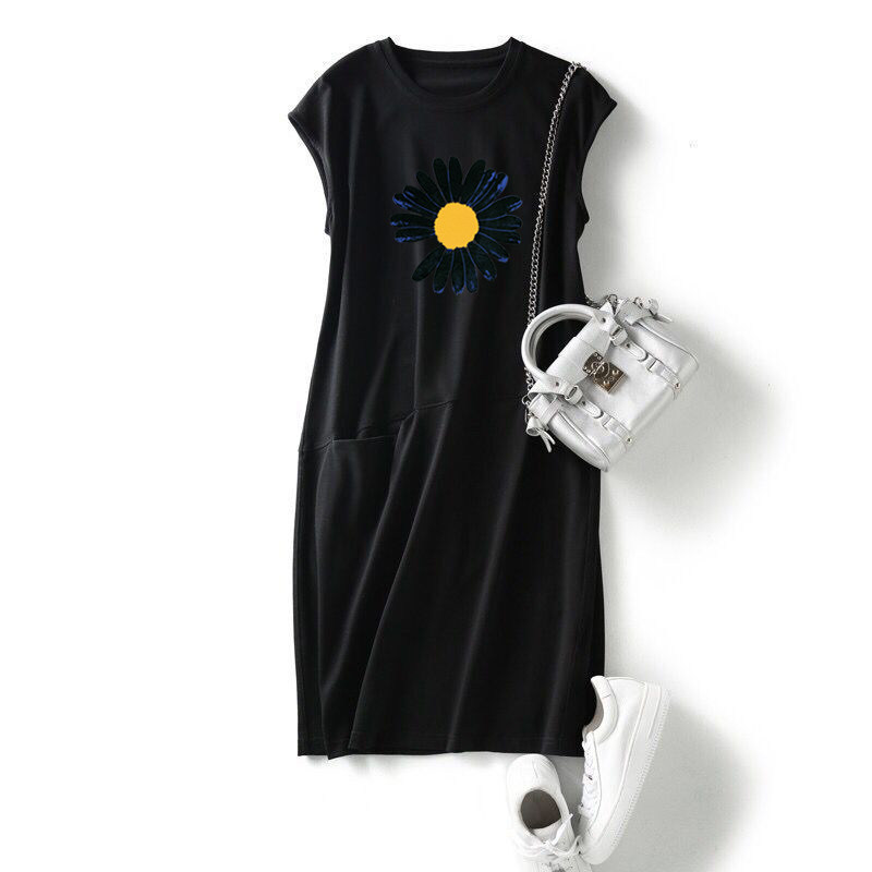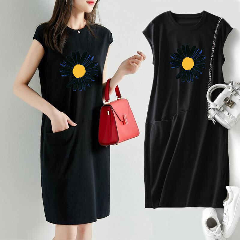 夏季新款短袖女装流行宽松显瘦菊花无袖T恤连衣裙中长口袋仙女裙
