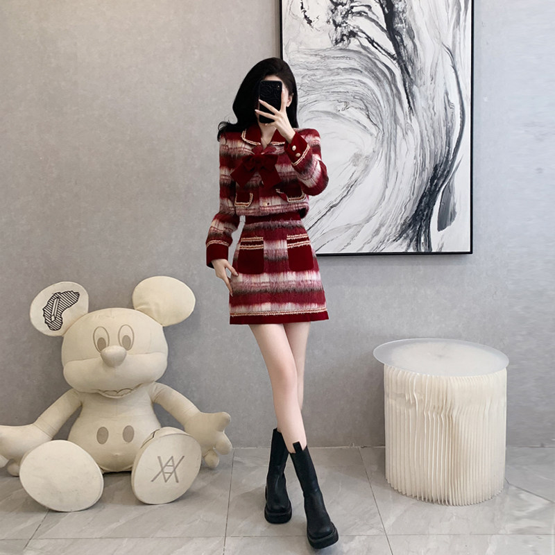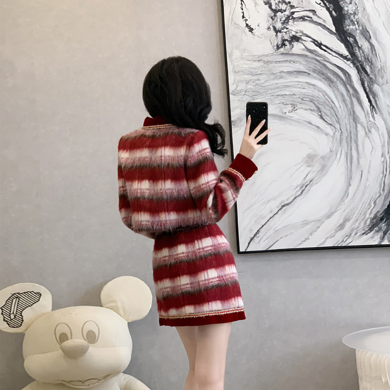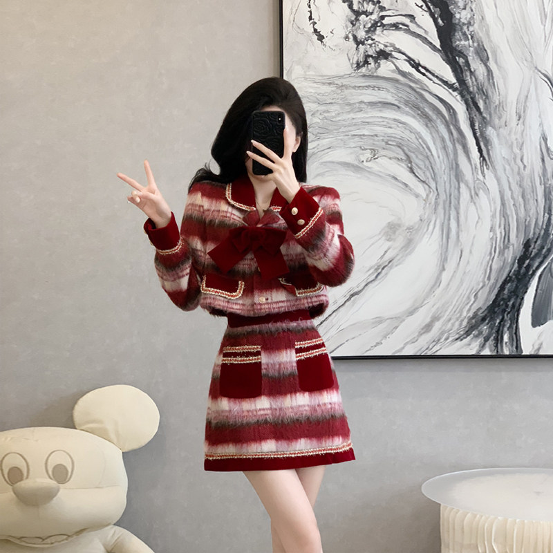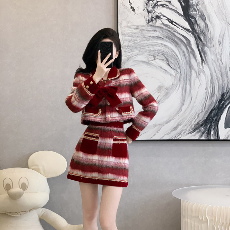 法式小香风格子毛呢外套套装女秋冬季高级感新年战袍半身裙两件套