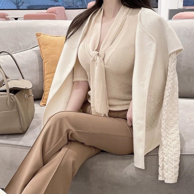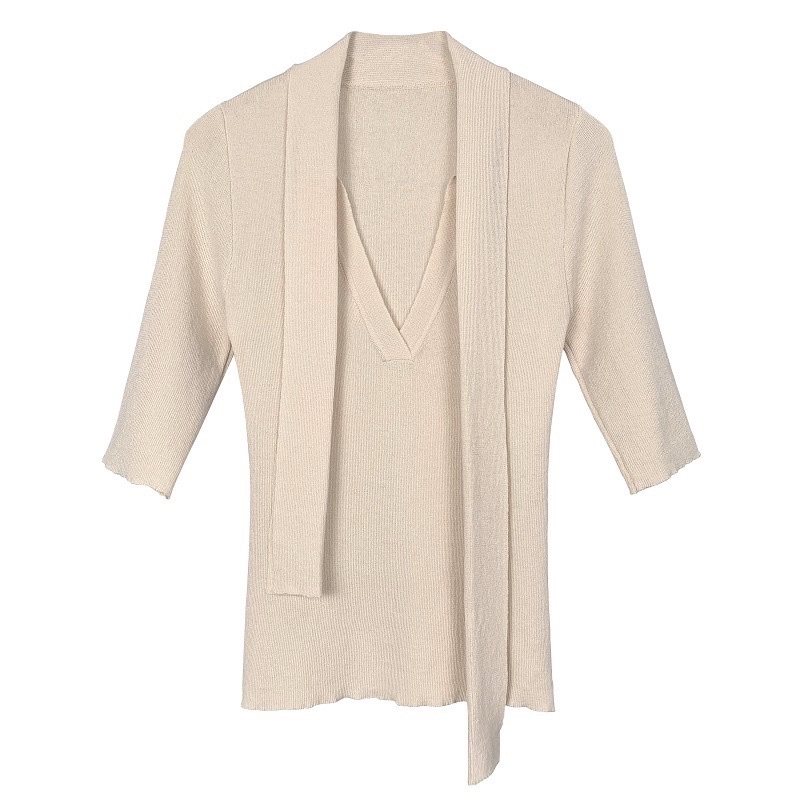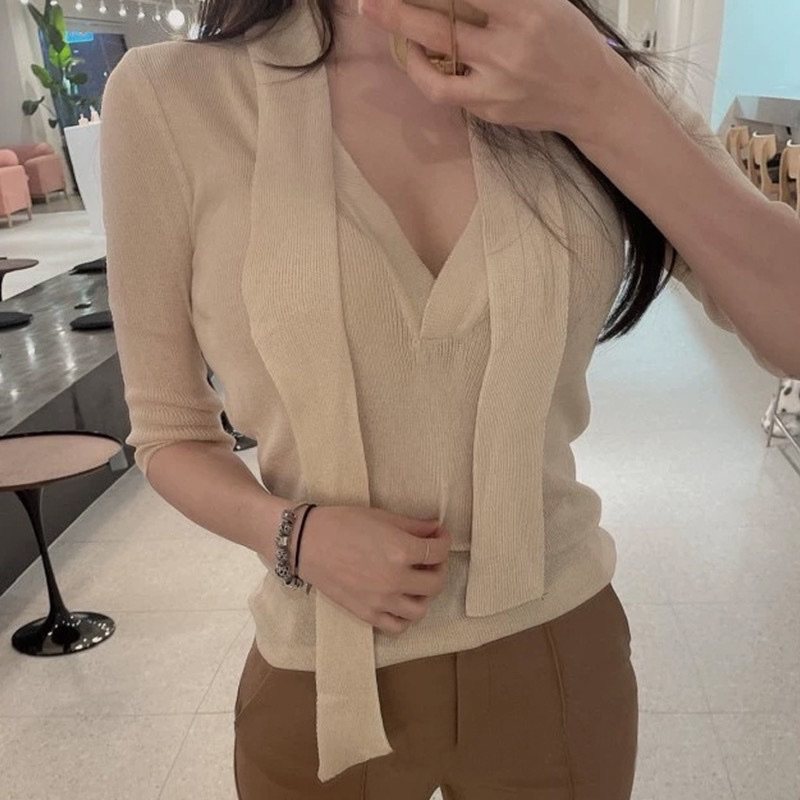 韩国东大门小心机飘带修身性感纯欲V领显胸薄款中袖针织衫上衣女