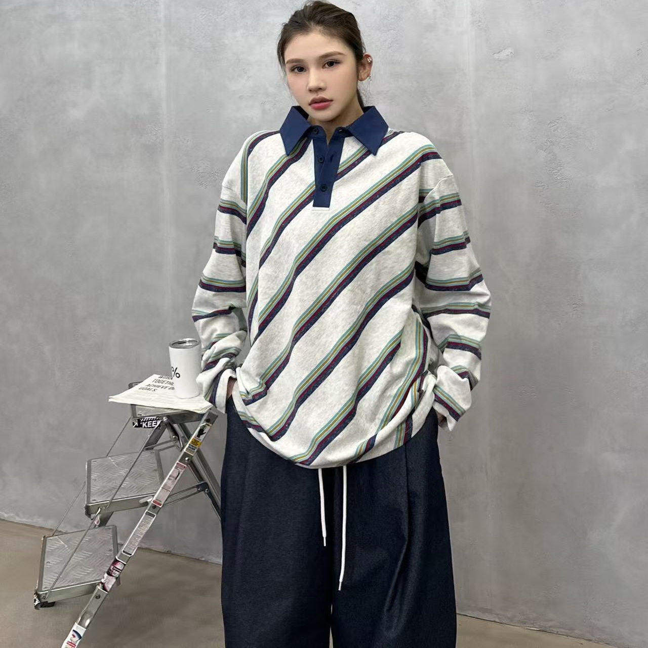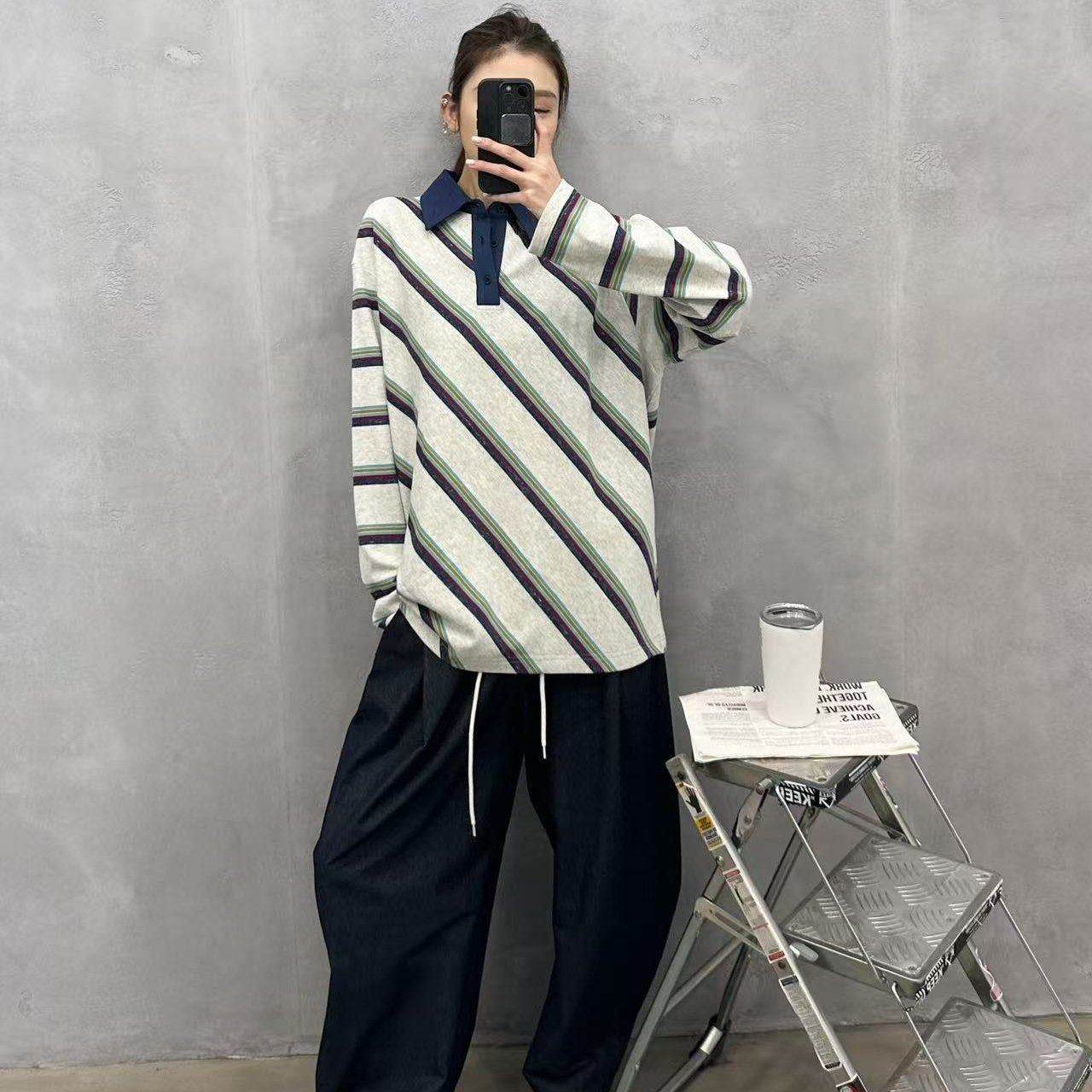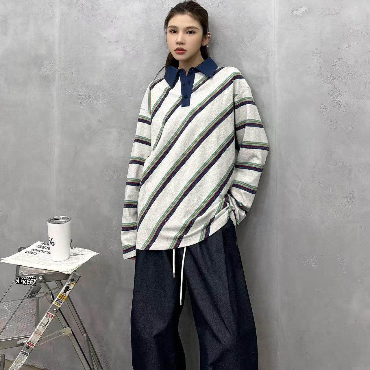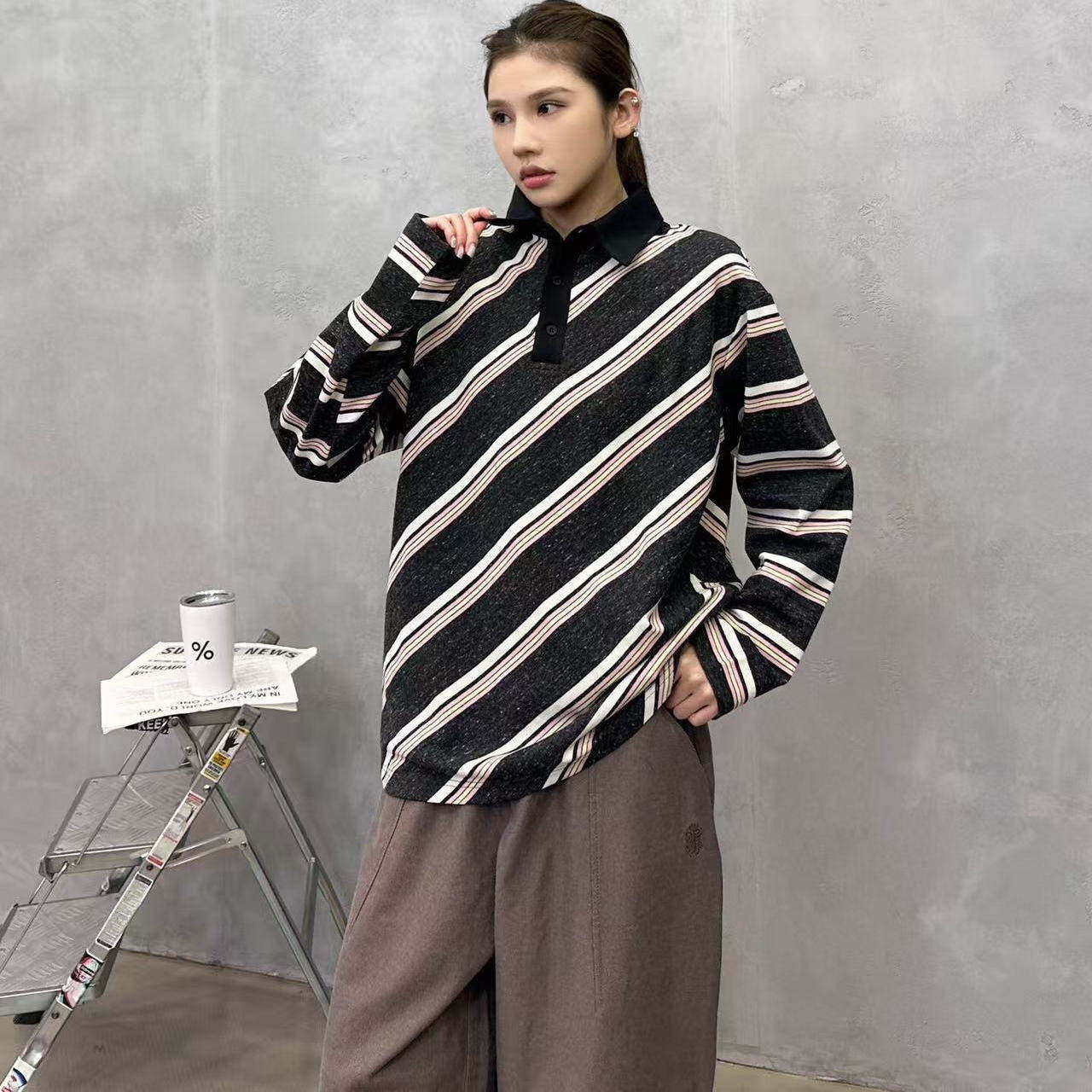 好漂亮拼色斜条纹T恤女2025年冬季新款打底衫宽松休闲上衣时尚潮