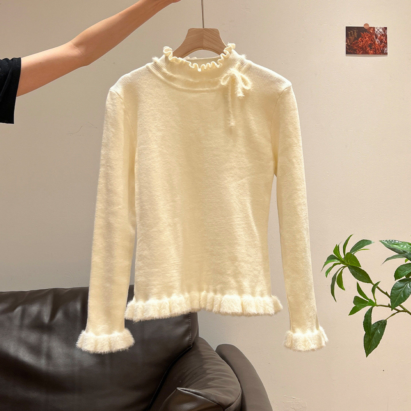 蝴蝶结木耳边半高领长袖针织打底衫内搭加厚毛衣秋冬可外穿上衣女