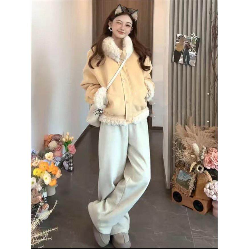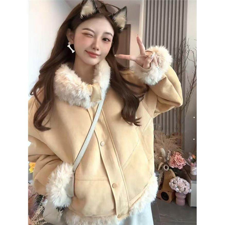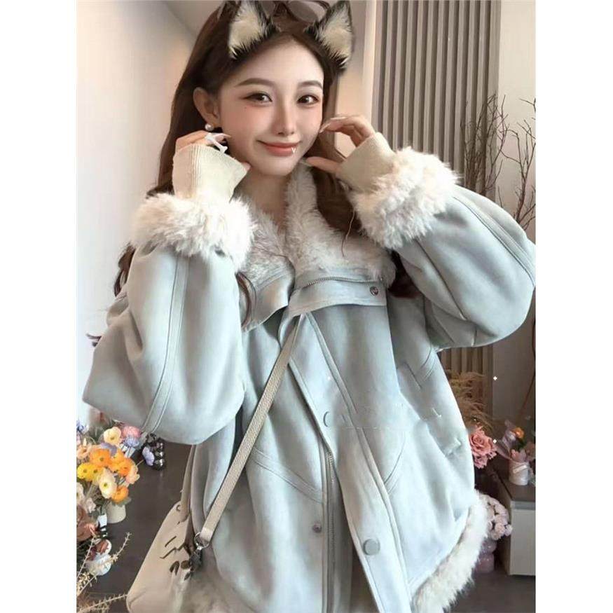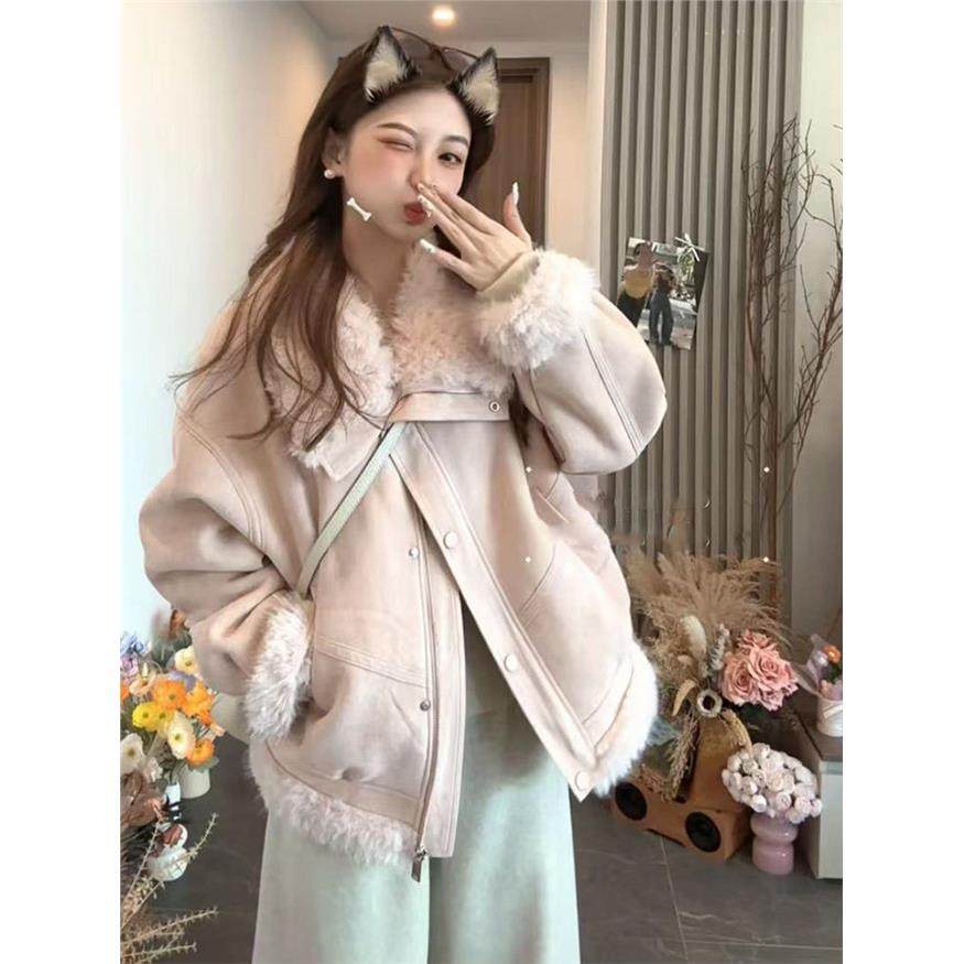 韩系翻领皮毛一体外套女2025秋冬新款宽松加厚设计感羊羔毛短外套