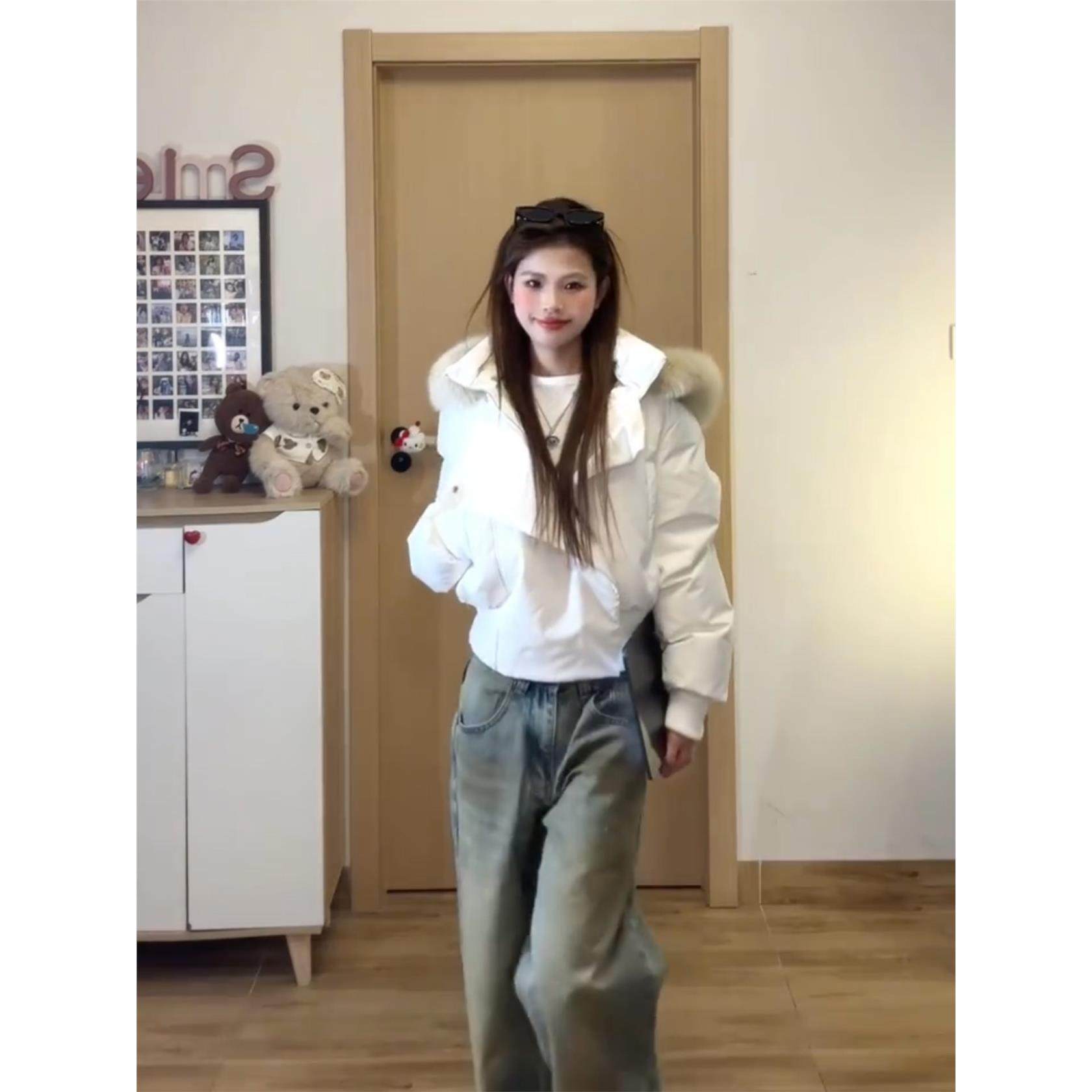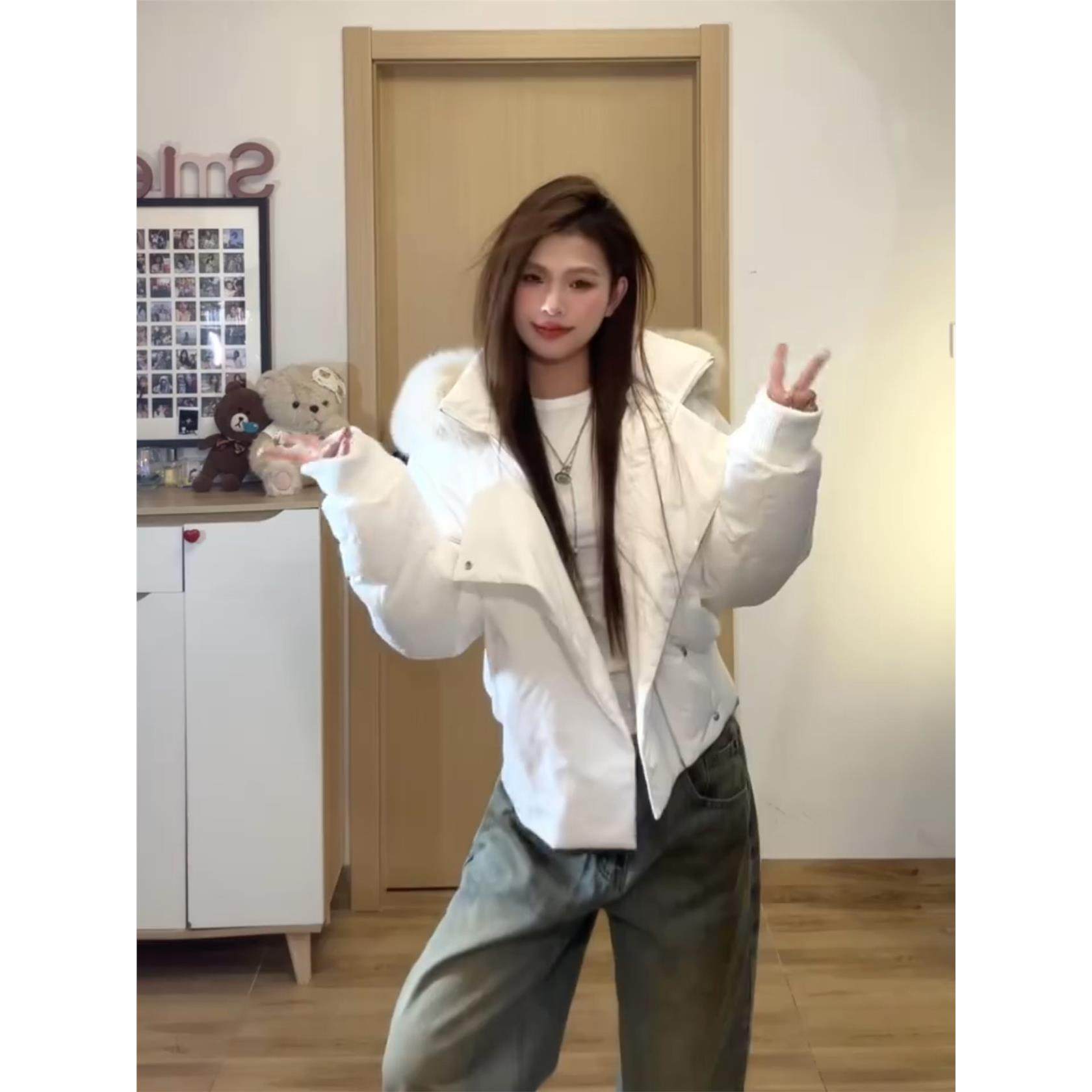 韩系覆古白色毛领短款羽绒棉服女2025年冬季新款加厚连帽棉袄外套