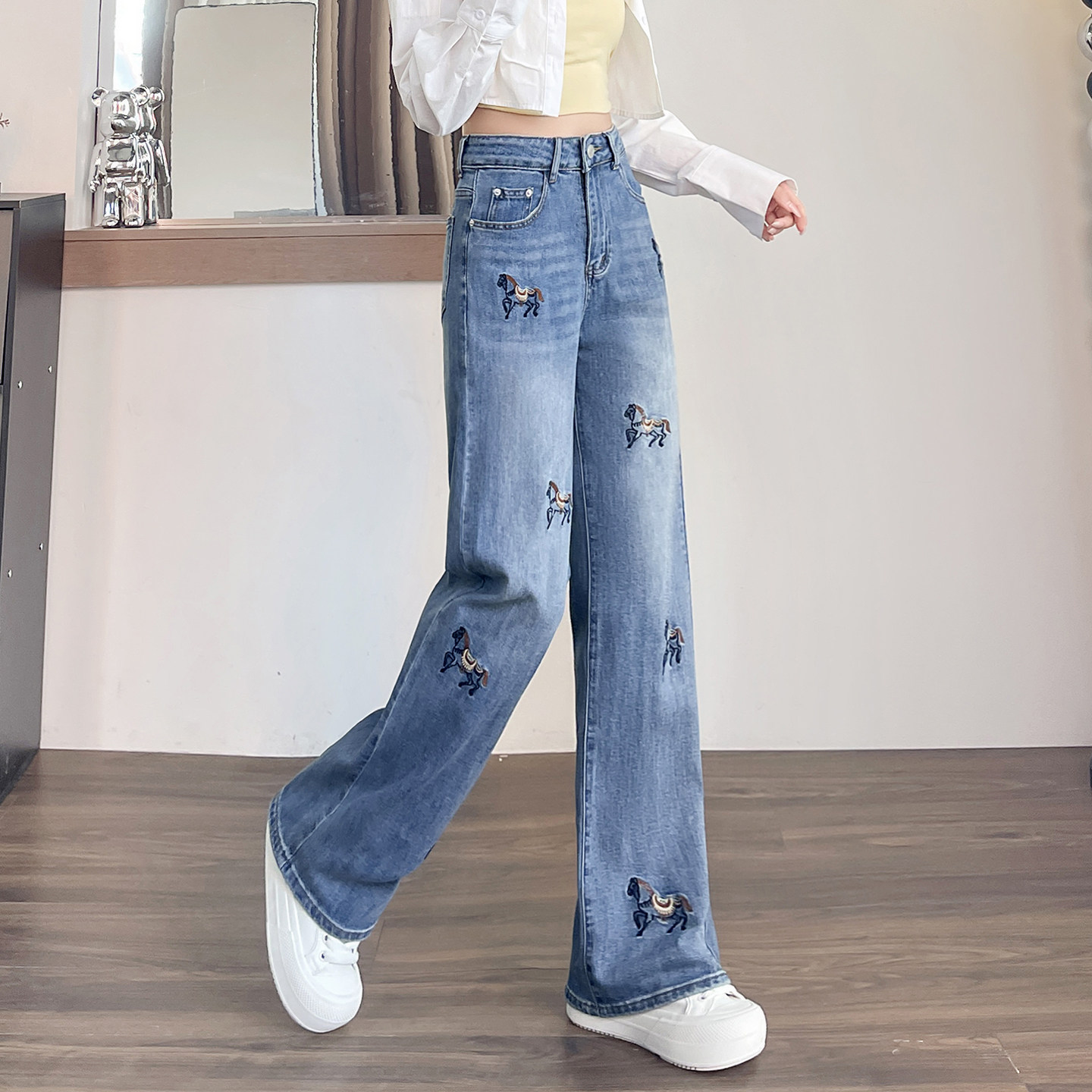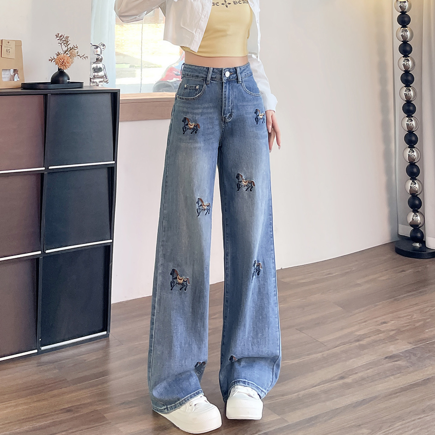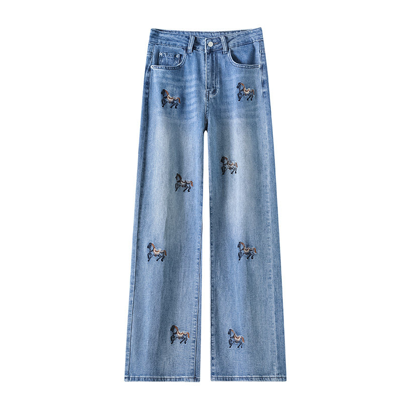 首页> 女装> 蓝色直筒牛仔裤女2026马年生肖复古重工刺绣慵懒直筒拖地阔腿长裤