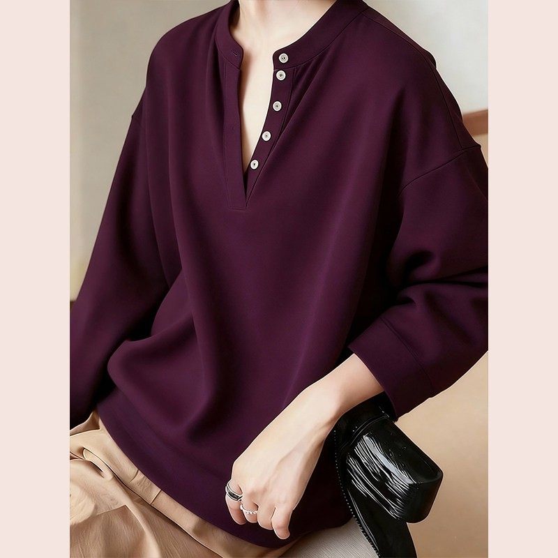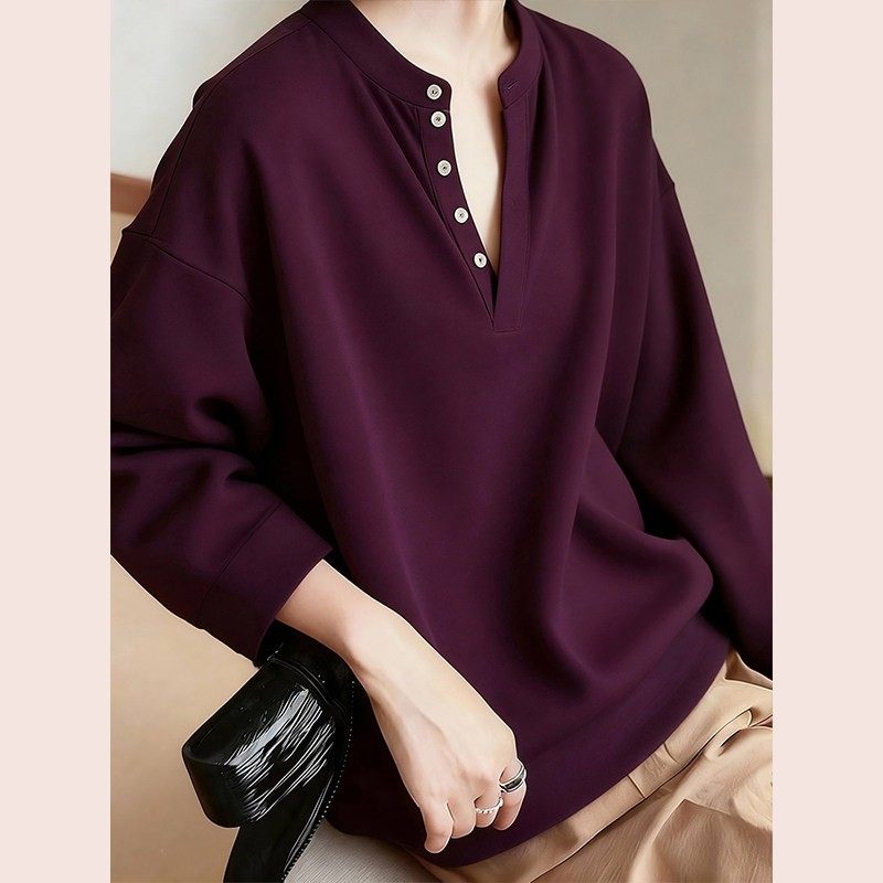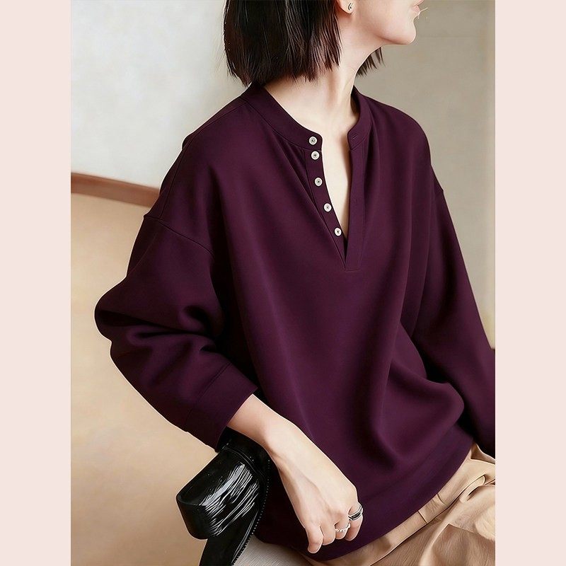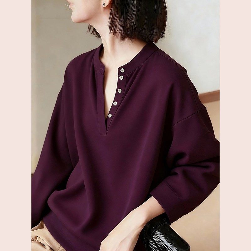 复古深紫色v领衬衫衬衣女款2025新款爆款独特漂亮打底衫冬季新款