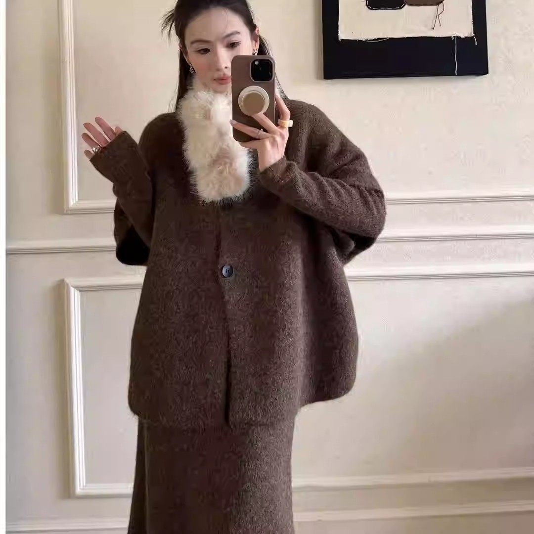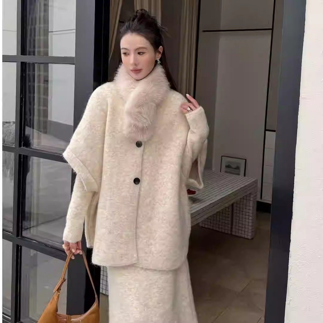 厚款宽松型蝙蝠开衫连衣裙毛领三件套设计师百搭秋冬时尚韩系套装