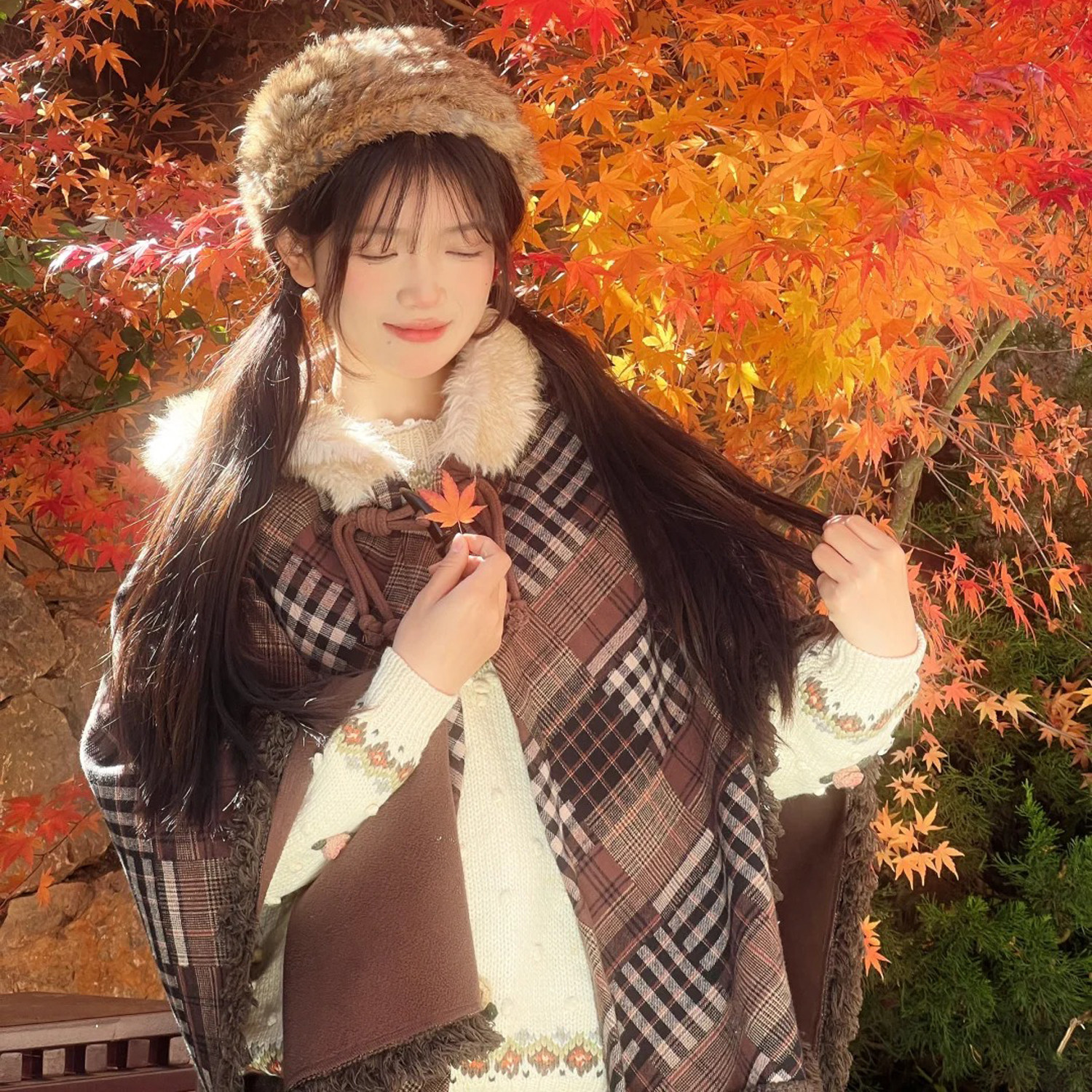 复古棕色格纹流苏连帽斗篷外套女高级感设计感小众时尚上衣外套潮