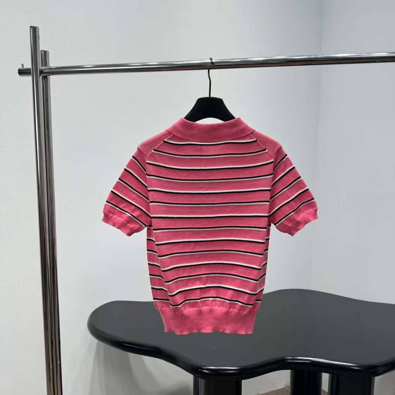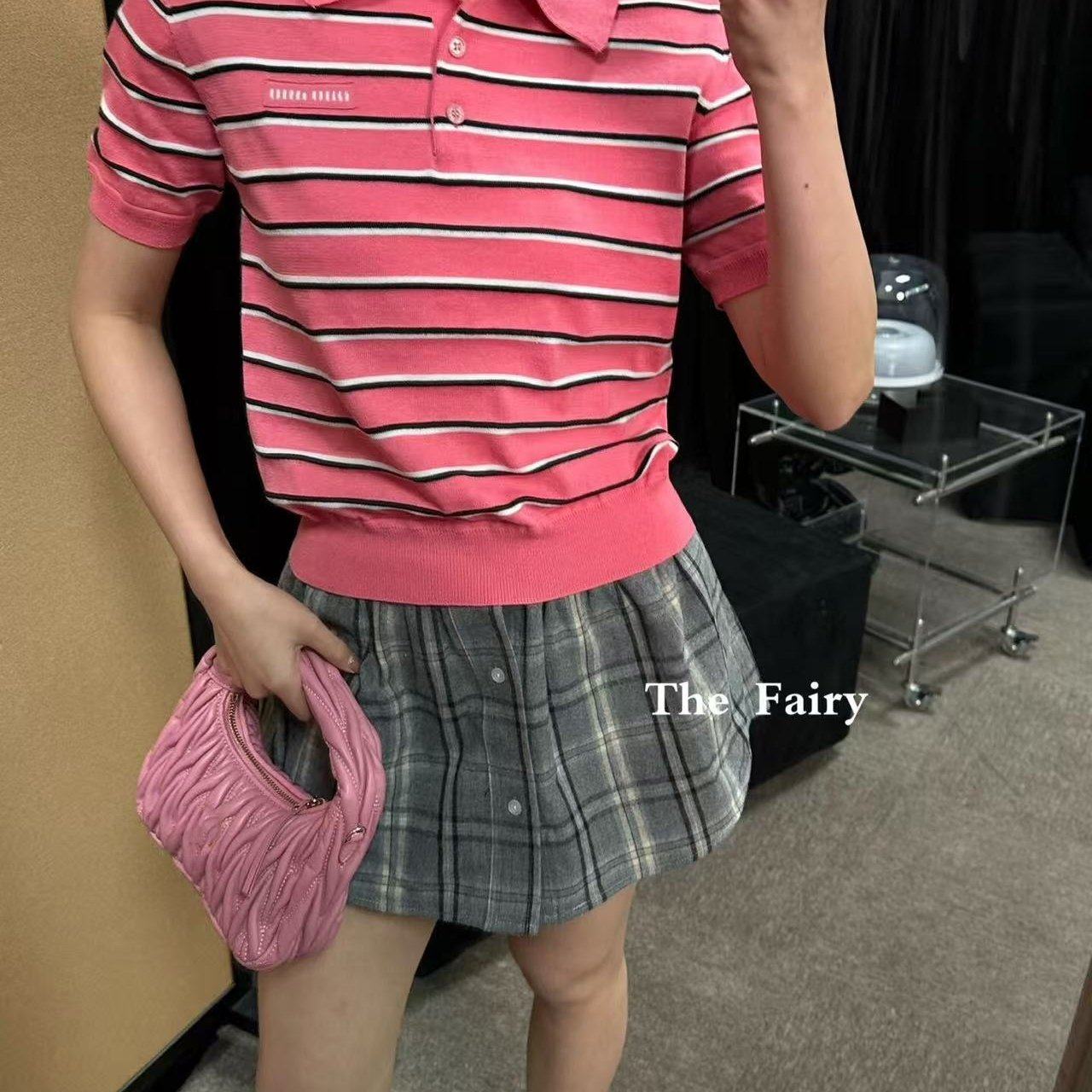 好漂亮玫粉色翻领条纹短袖针织衫女2026年早春新款短上衣宽松休闲