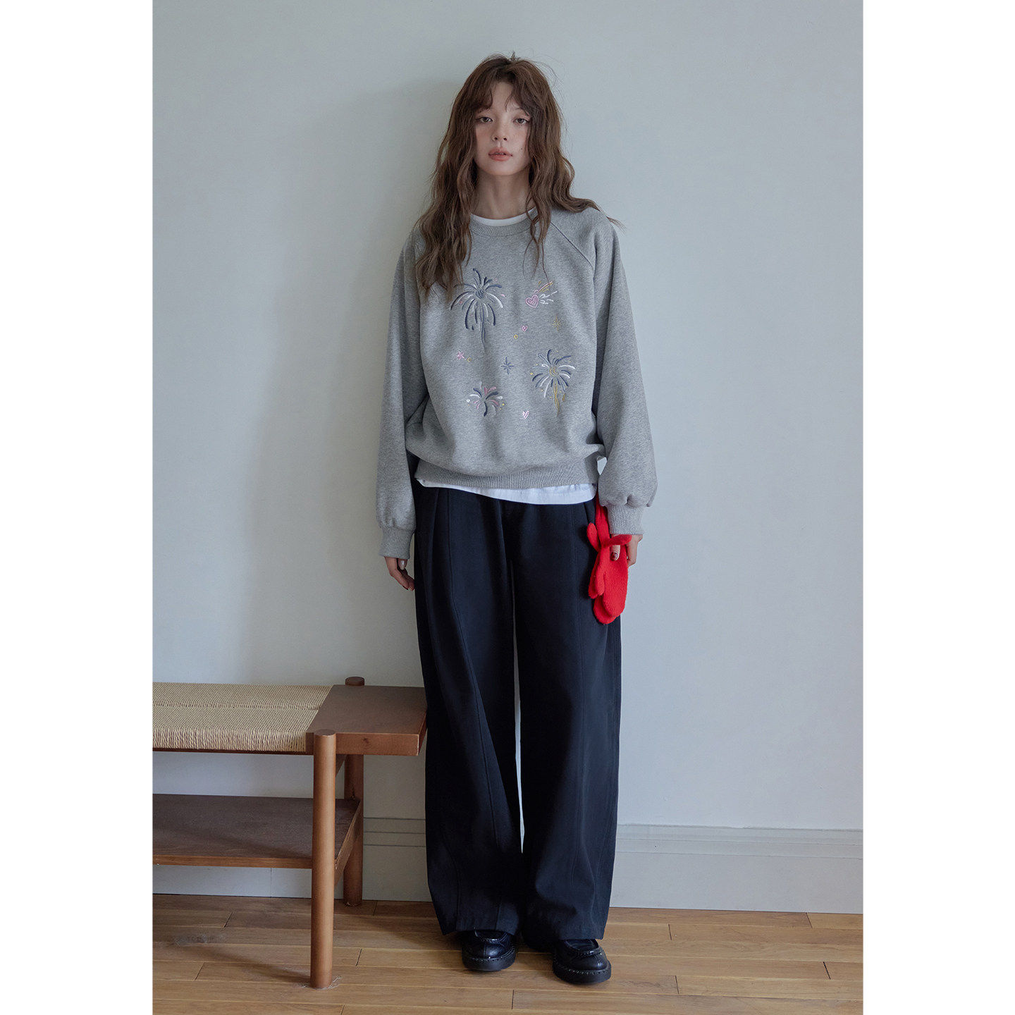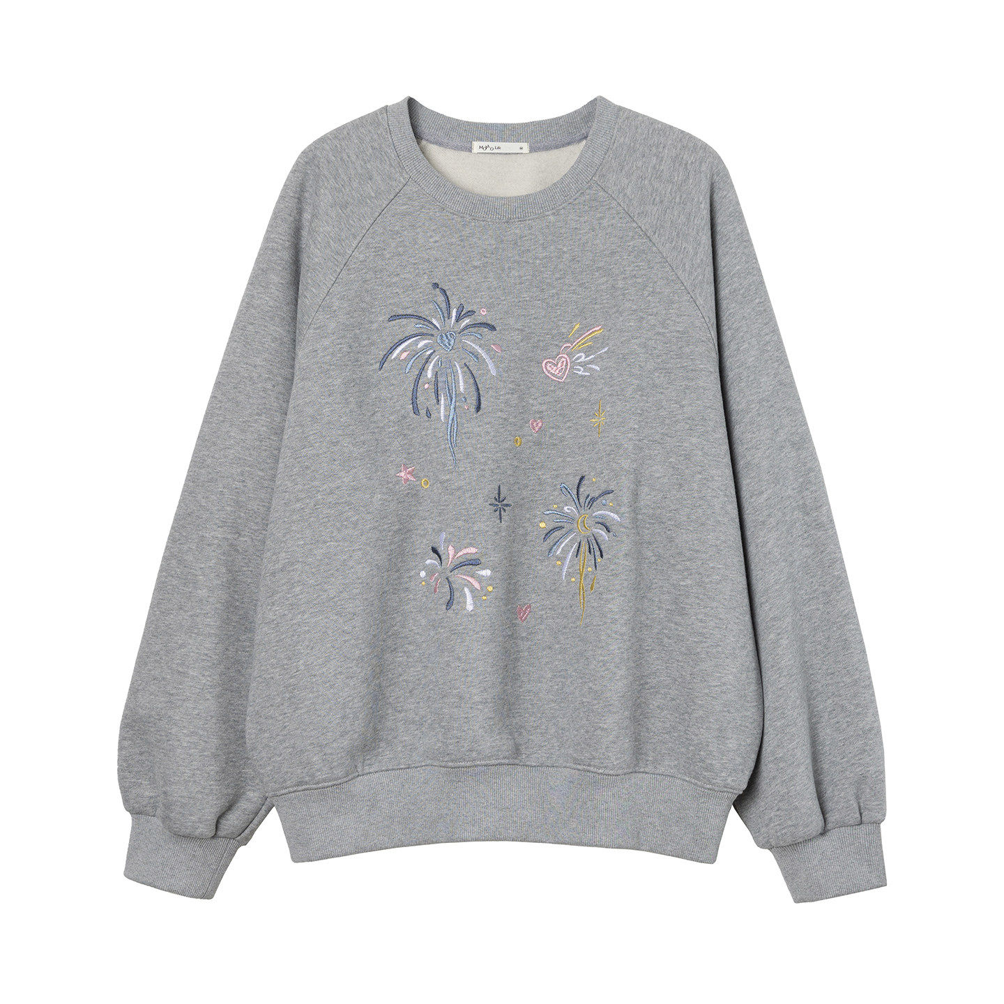 Momolife彩色烟花刺绣灰色插肩长袖2025女冬套头加绒保暖宽松卫衣