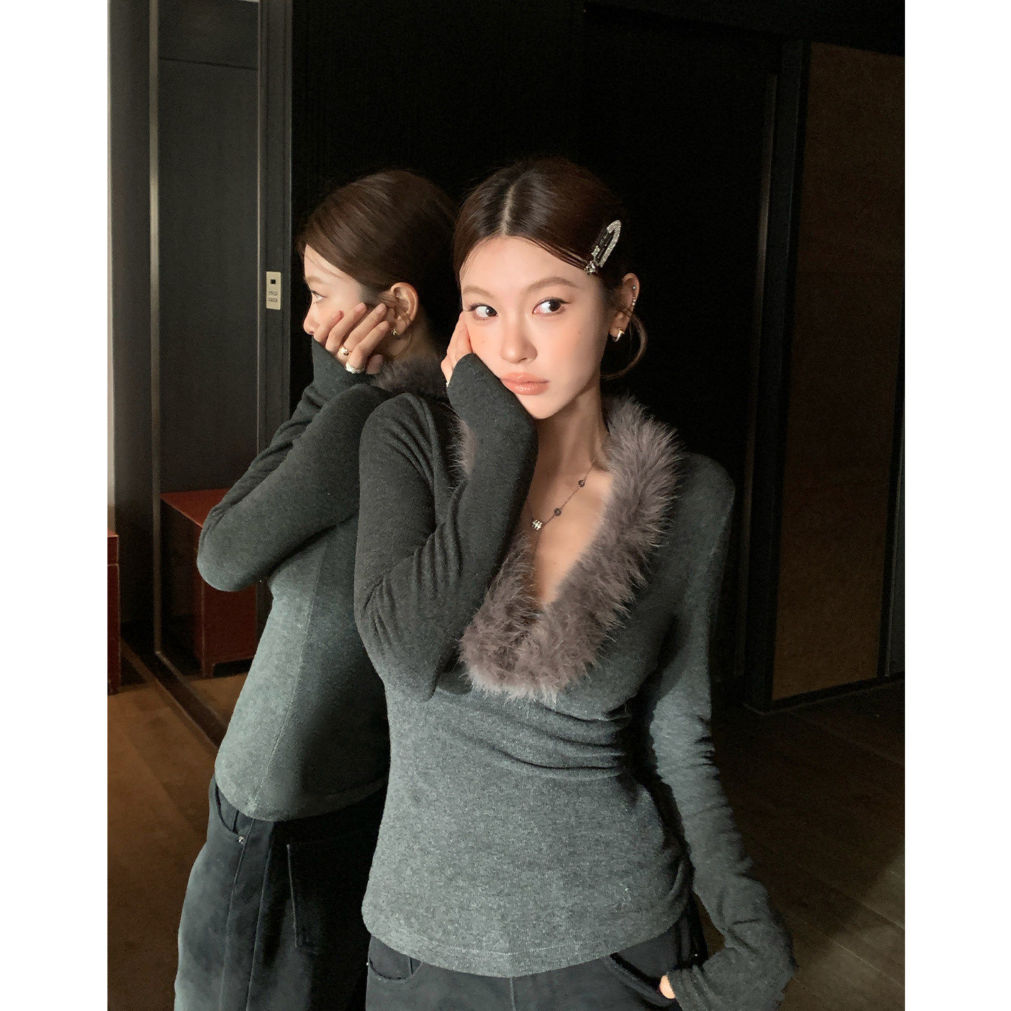HAMYIHO 内搭女毛领上衣冬季针织衫修身毛衣毛毛打底衫设计感小众