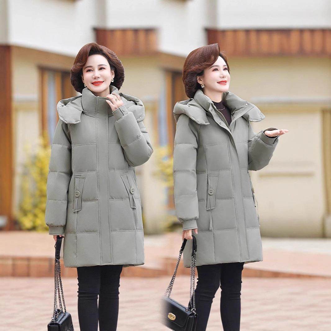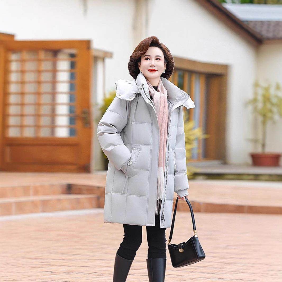 中8309年妈妈款羽绒服女冬装中长绒加厚中老年女羽帽连保暖外套防
