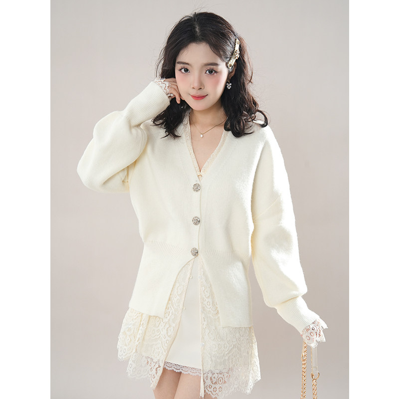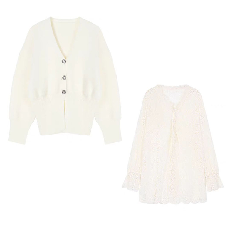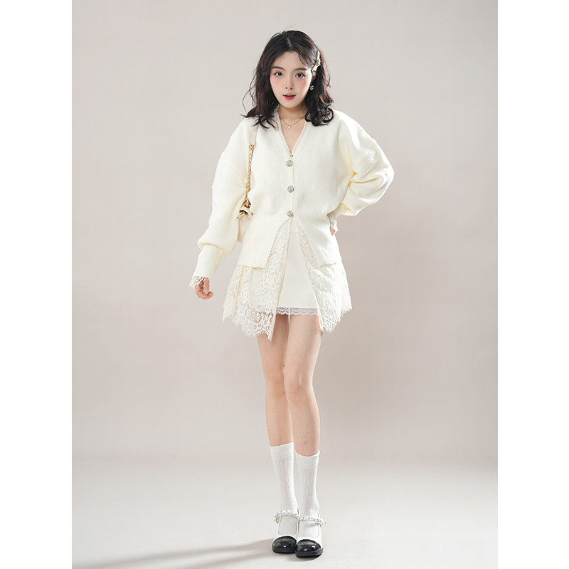韩系千金感套装女春季2025新款蕾丝衬衫+v领针织开衫+半裙三件套