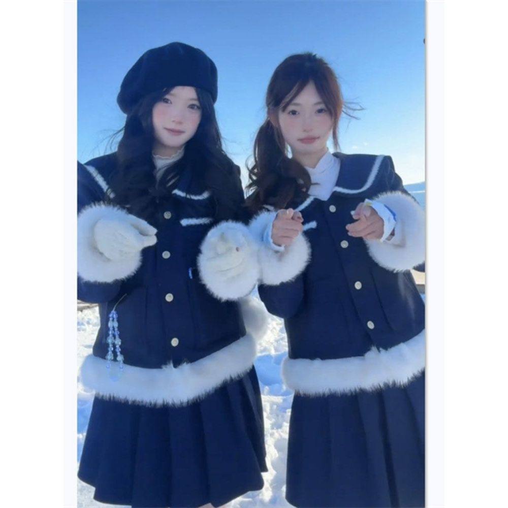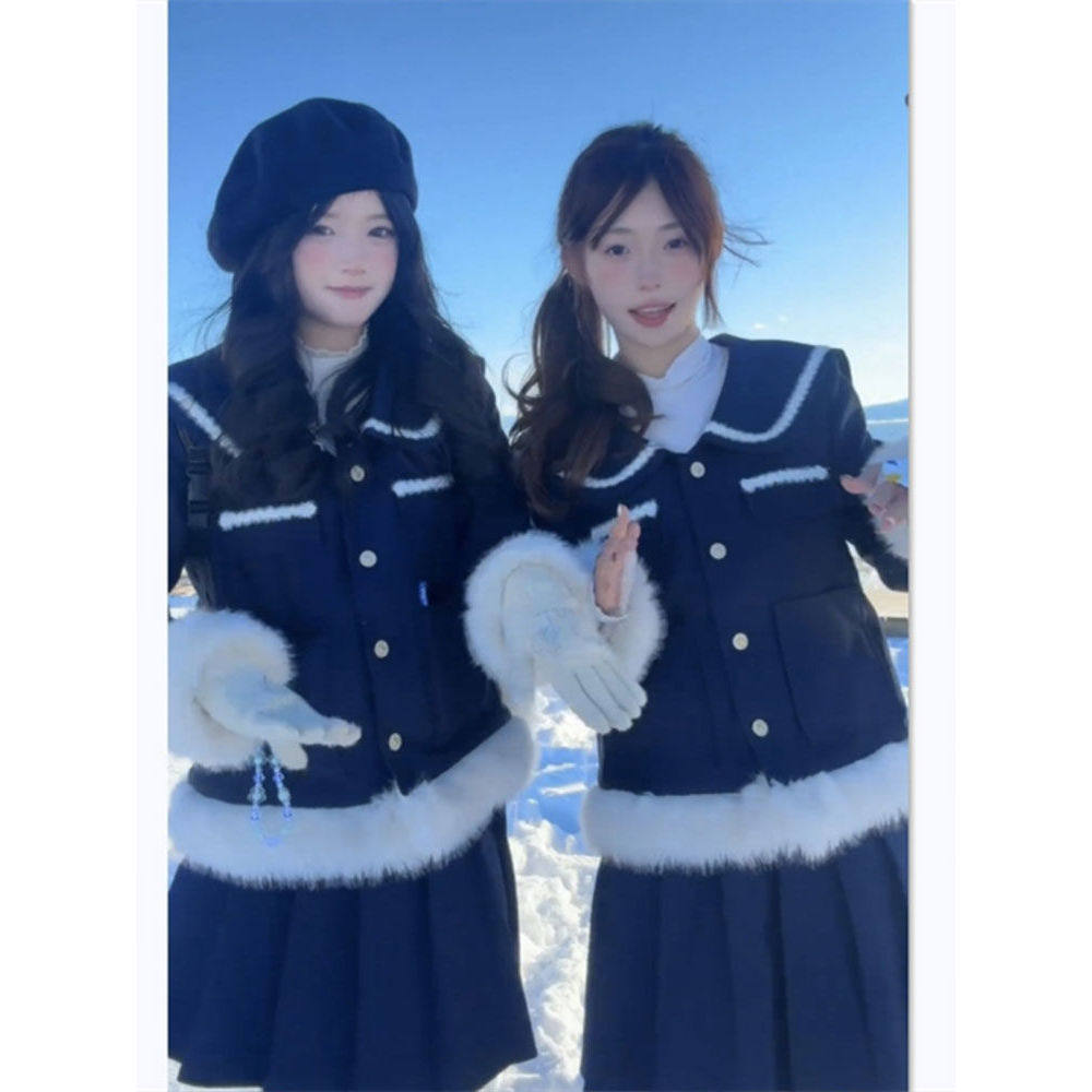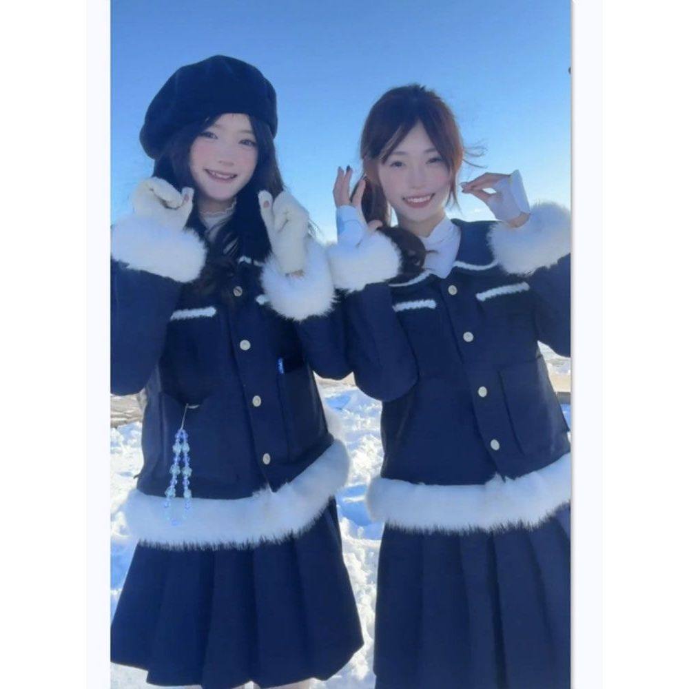 韩系高级感毛毛拼色外套秋冬千金风加厚小香风上衣开衫百褶裙套装