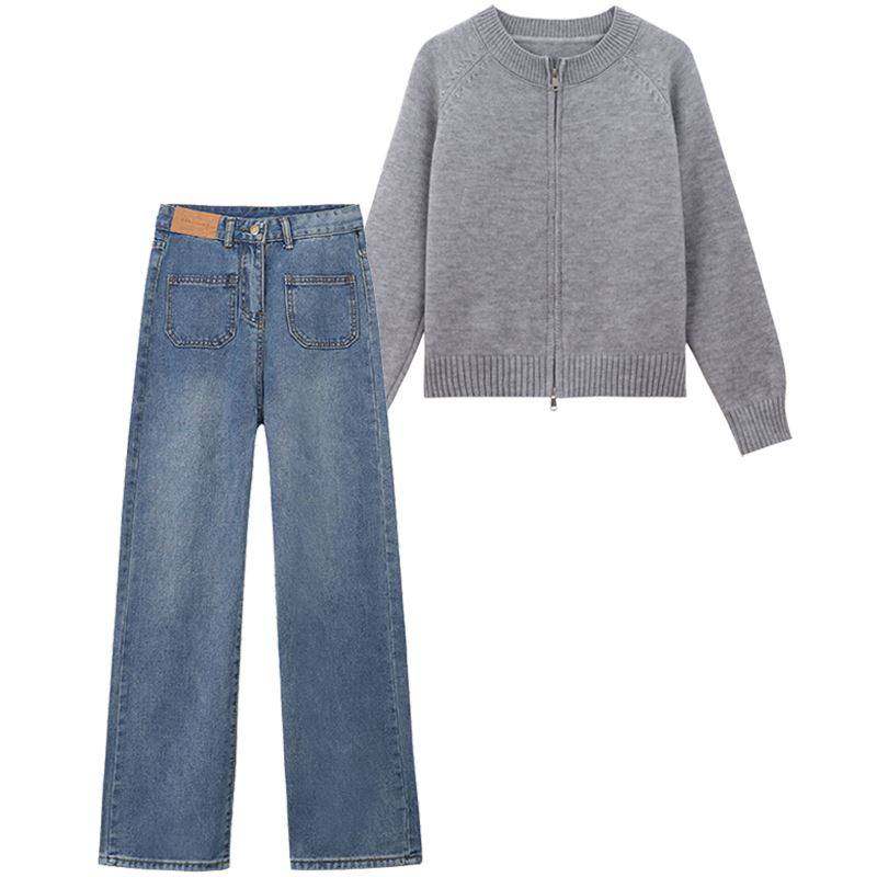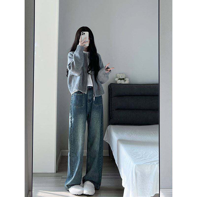蓝色毛衣外套女针织开 衫学生国潮牌秋冬外穿拉炼 炼 上衣通勤卫