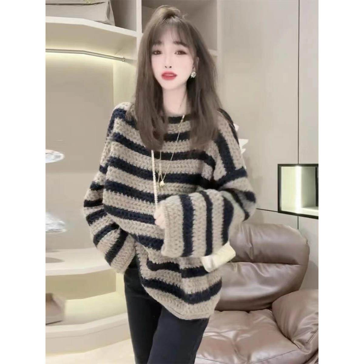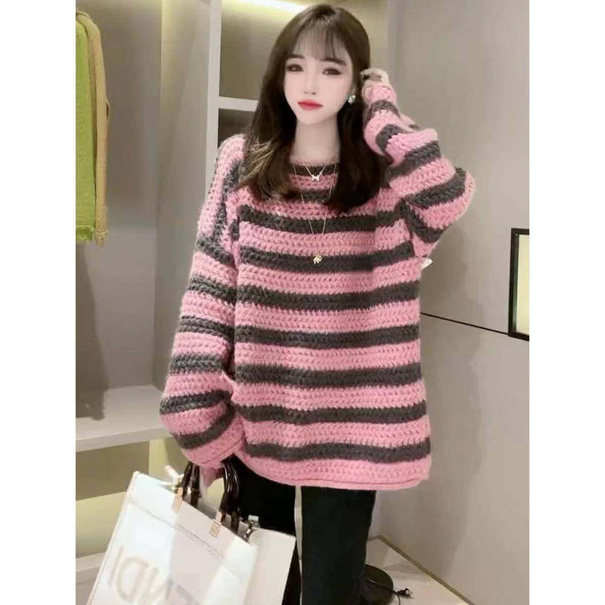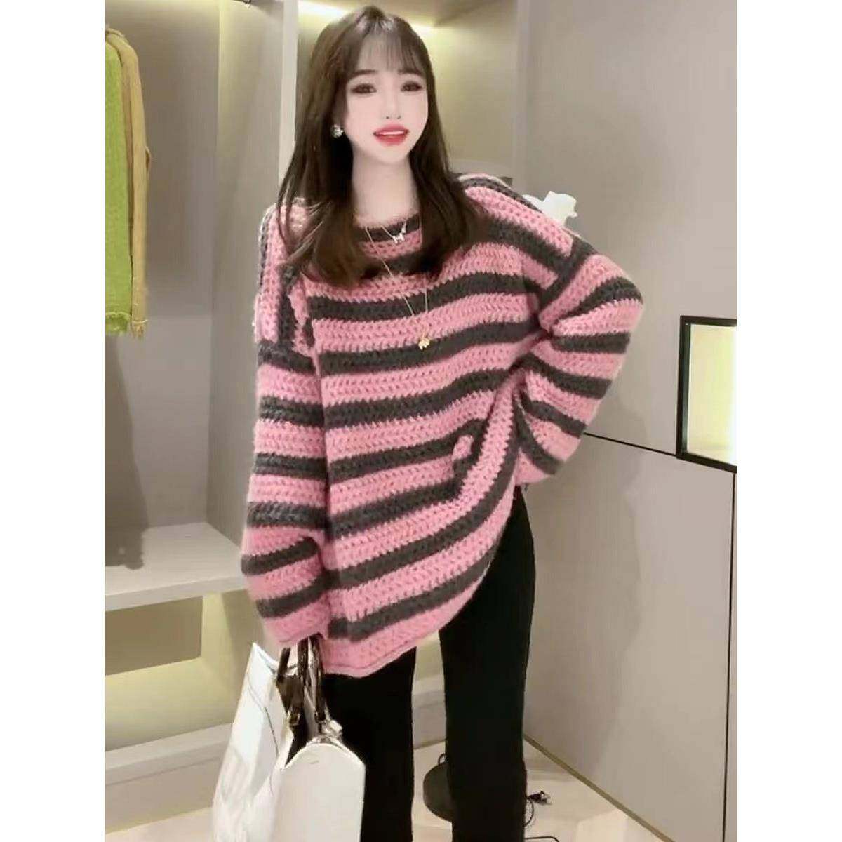 首页> 女装> 欧洲站一字领加厚粉色慵懒风毛衣女2025年秋冬新款覆古宽松针织衫
