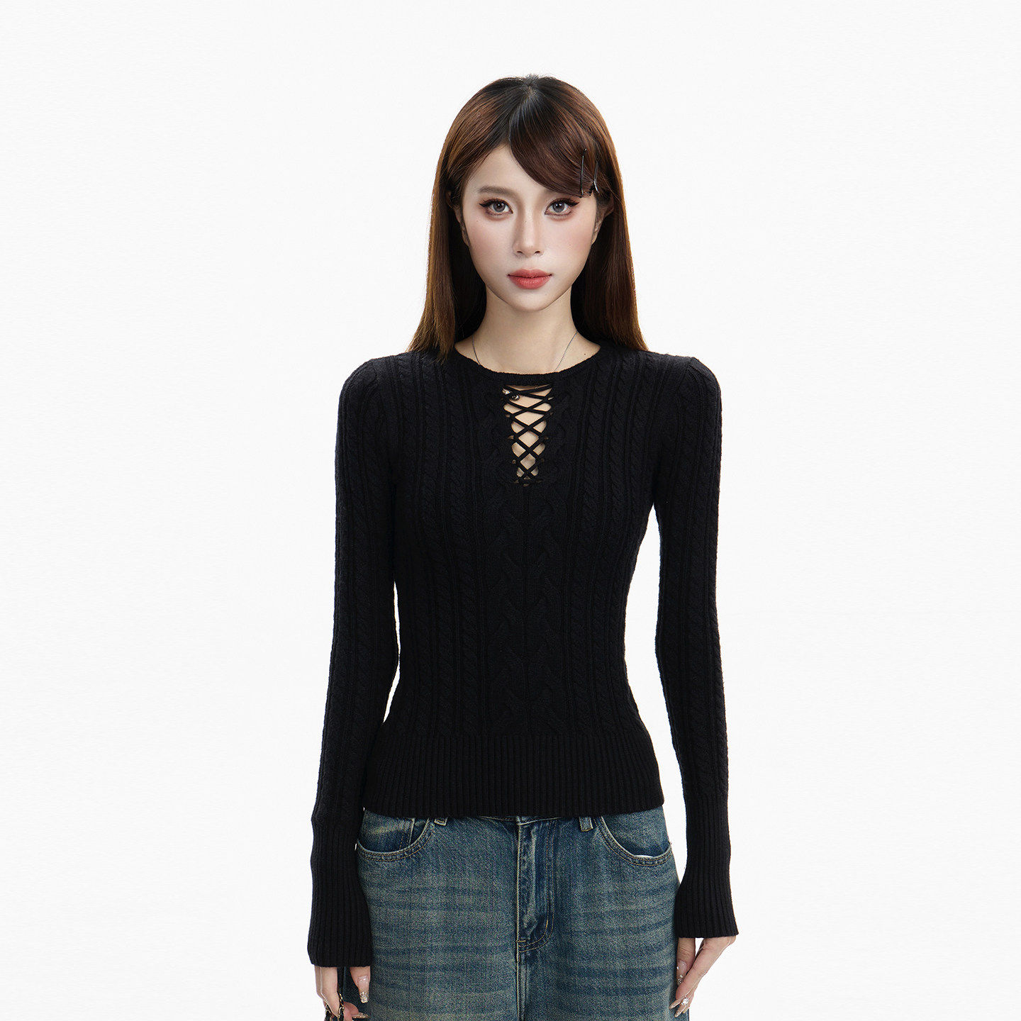 黑色圆领镂空毛衣女2025秋冬设计感复古修身显瘦针织打底衫上衣