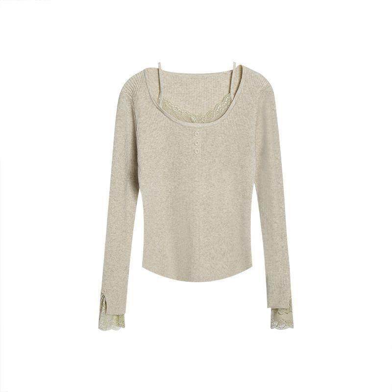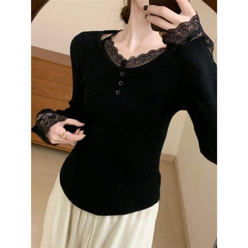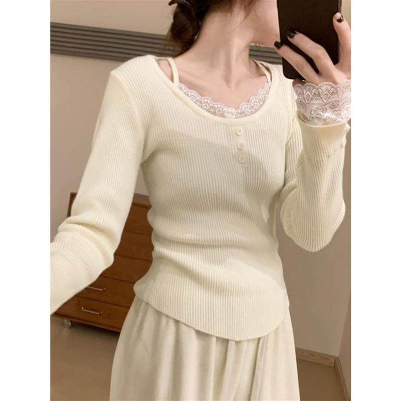 法式蕾丝花边针织衫女秋冬季设计感修身长袖毛衣纯欲内搭打底上衣