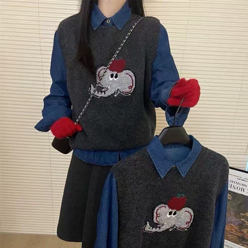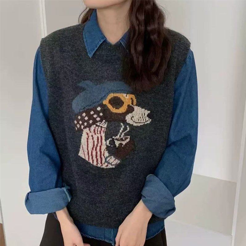包邮韩系气质卡通狗针织衫马甲女欧货套头减龄软糯背心衬衫上衣两