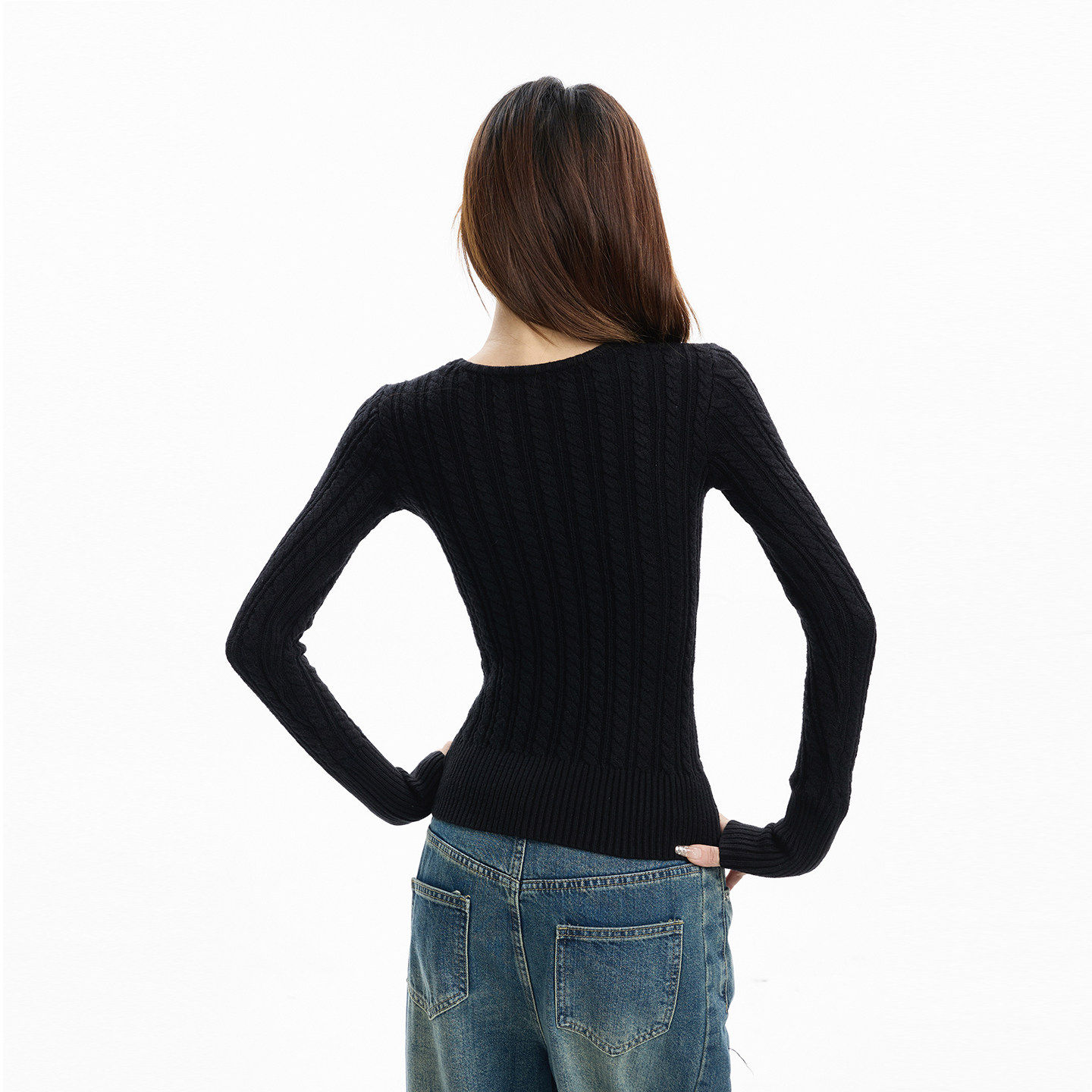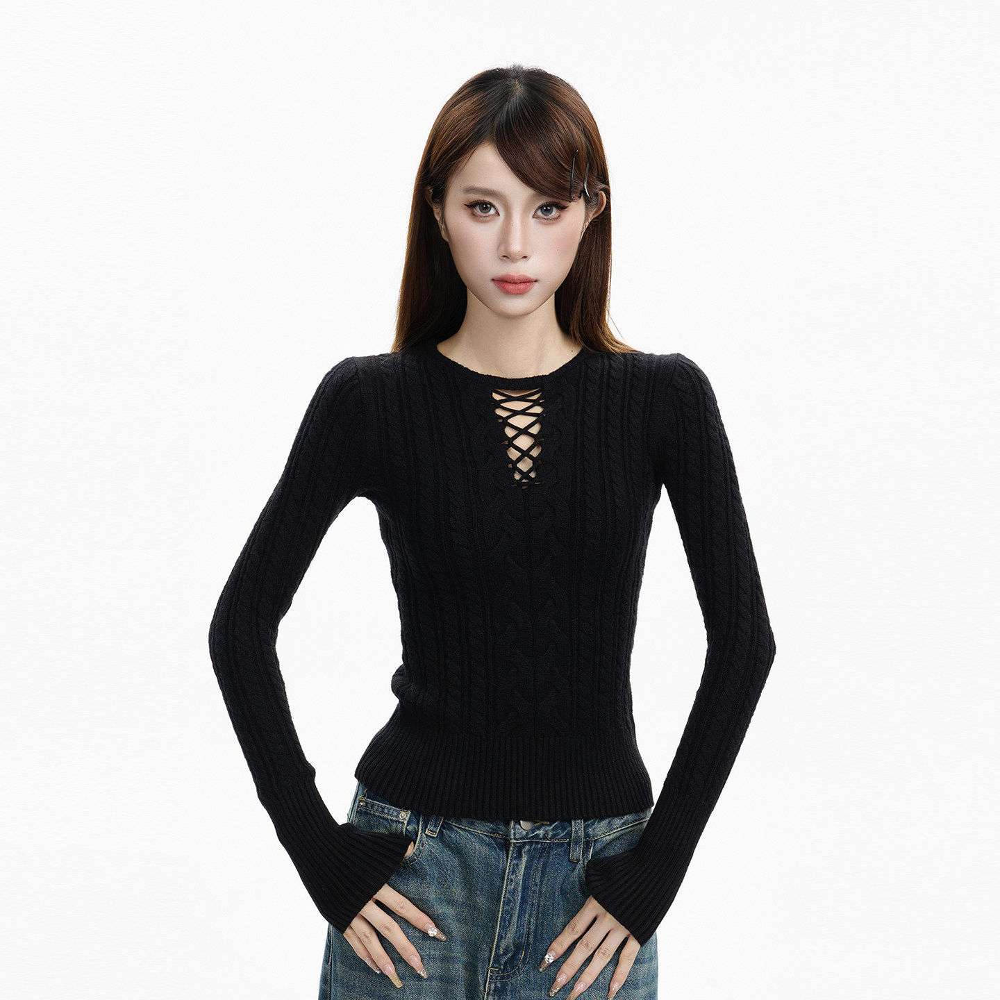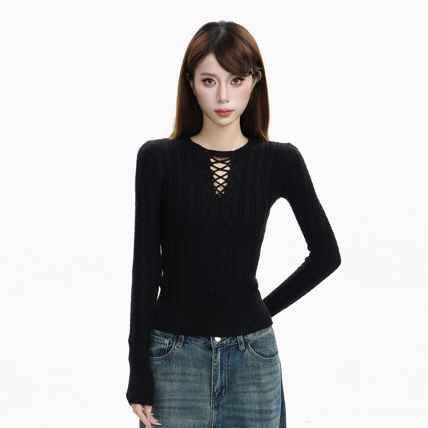 黑色圆领镂空毛衣女2025秋冬设计感复古修身显瘦针织打底衫上衣