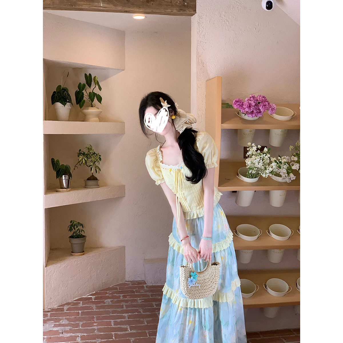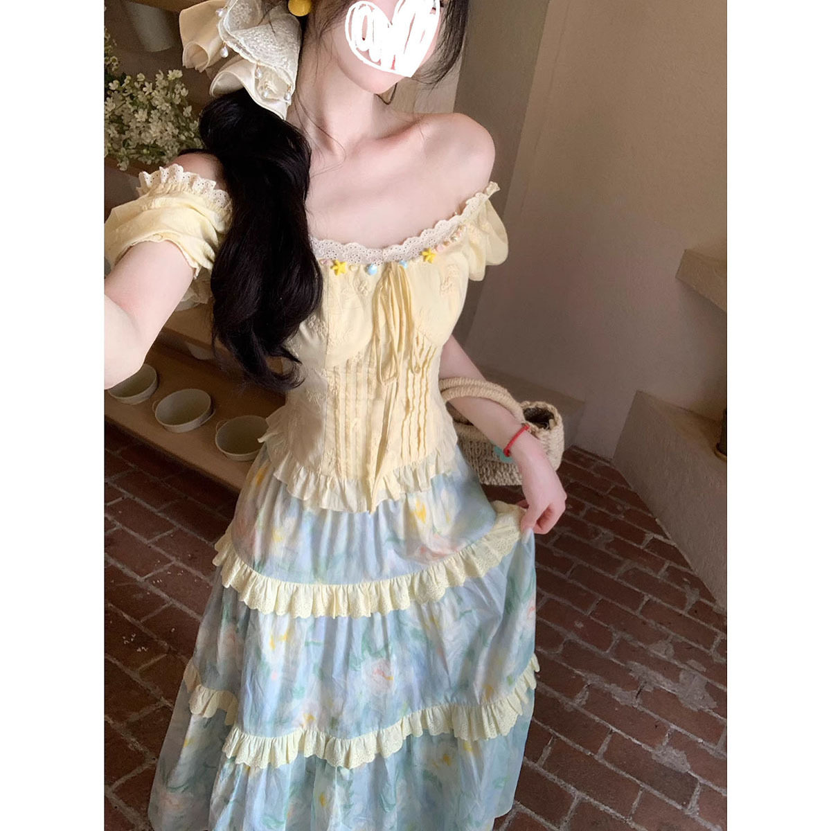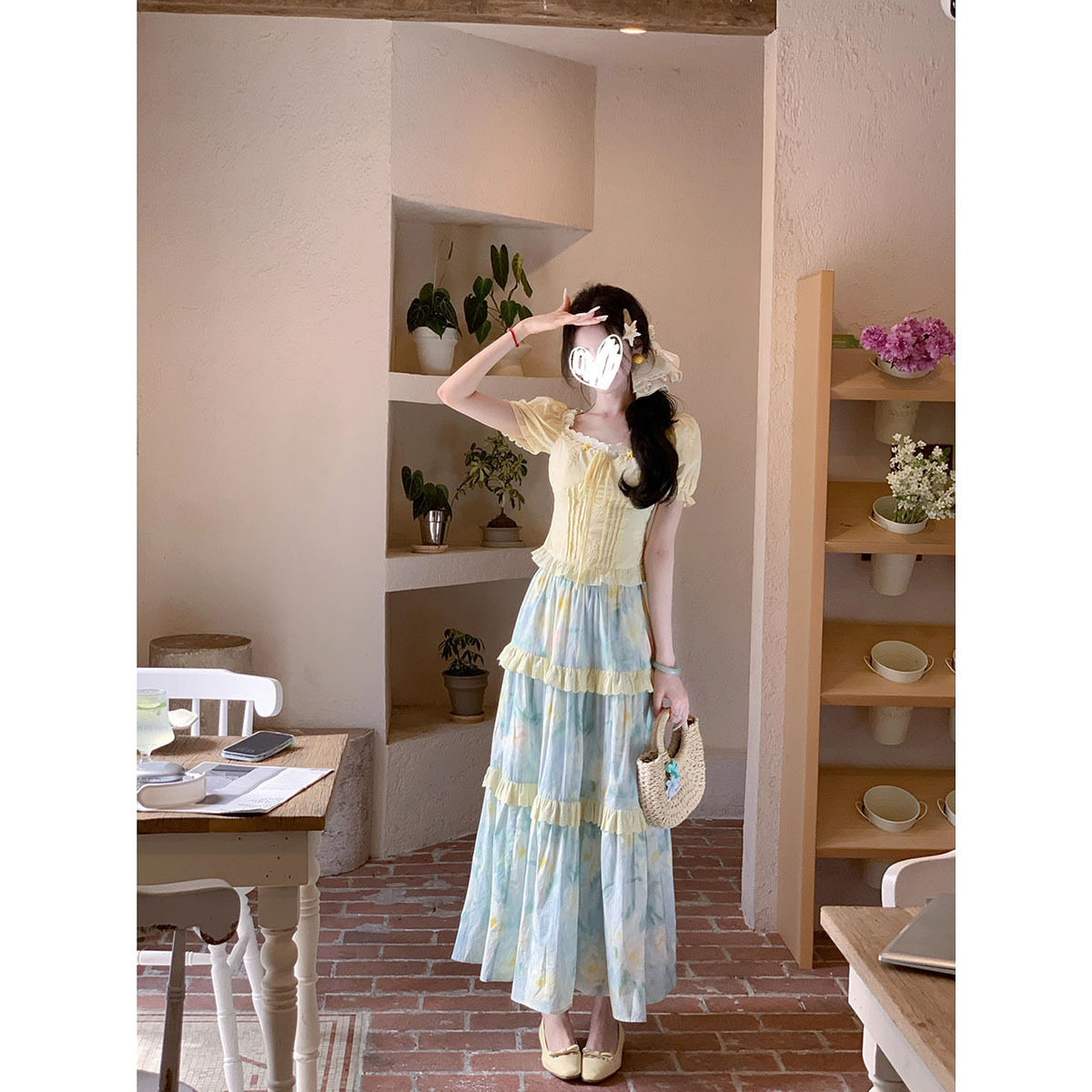 甜美风温柔短袖娃娃衫衬衫系带上衣女夏季油画蛋糕裙半身裙两件套