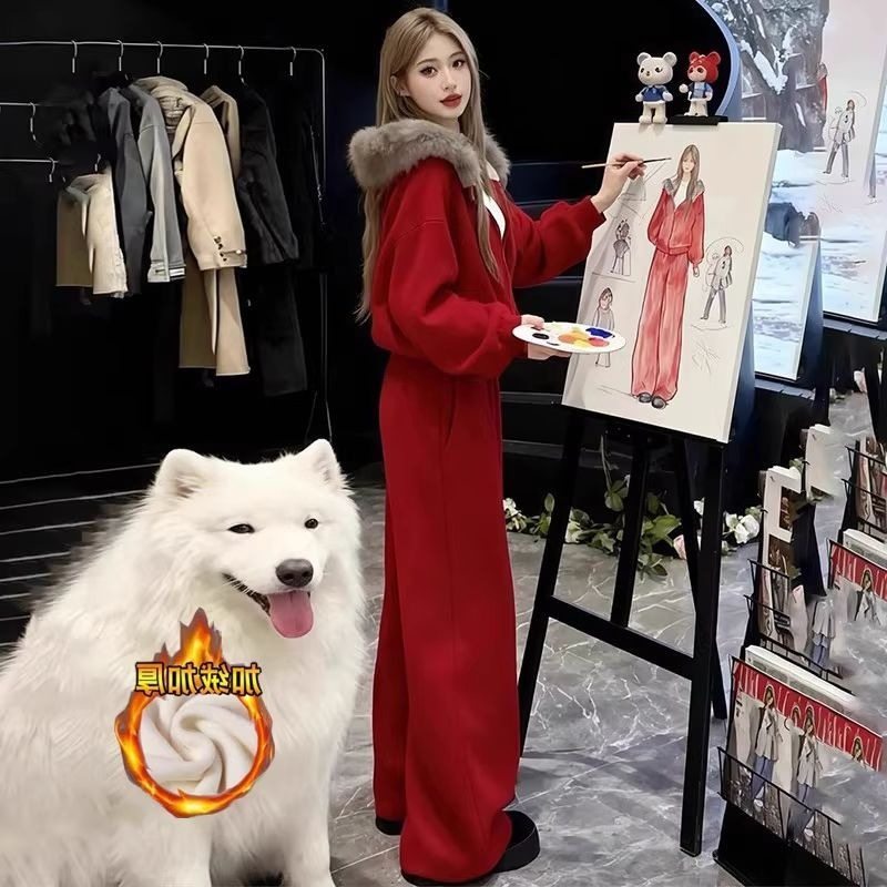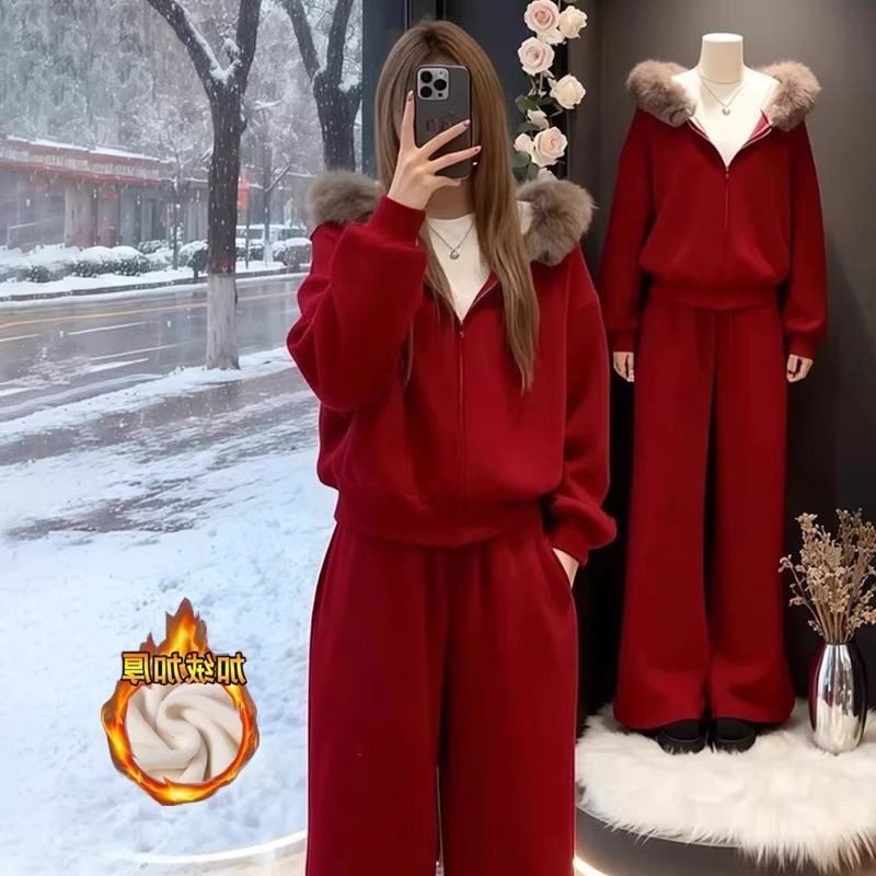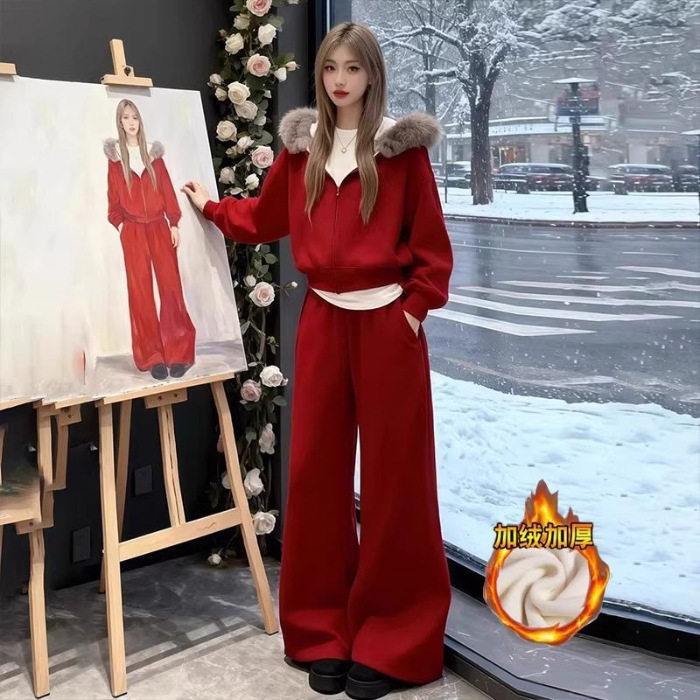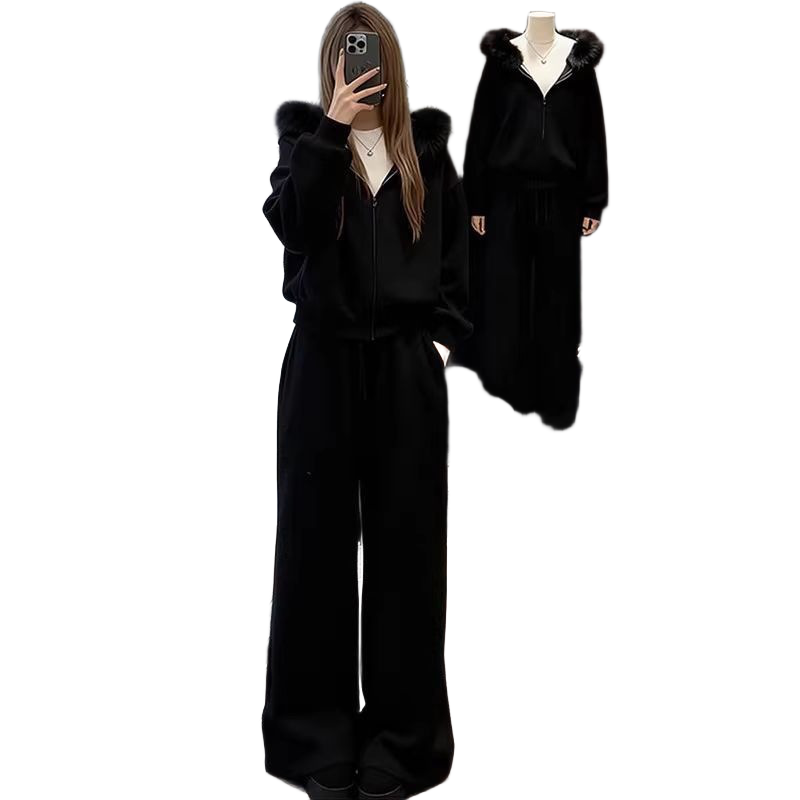 一整套时尚套装女秋冬新款韩版加绒休闲毛领开衫外套阔腿裤两件套
