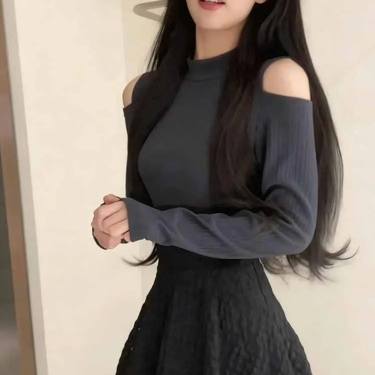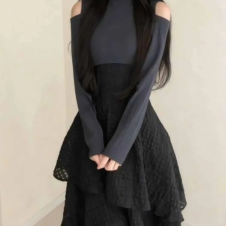 首页> 女装> 日系温柔甜美撞色拼接露肩连衣裙女冬设计感收腰不规则荷叶边长裙