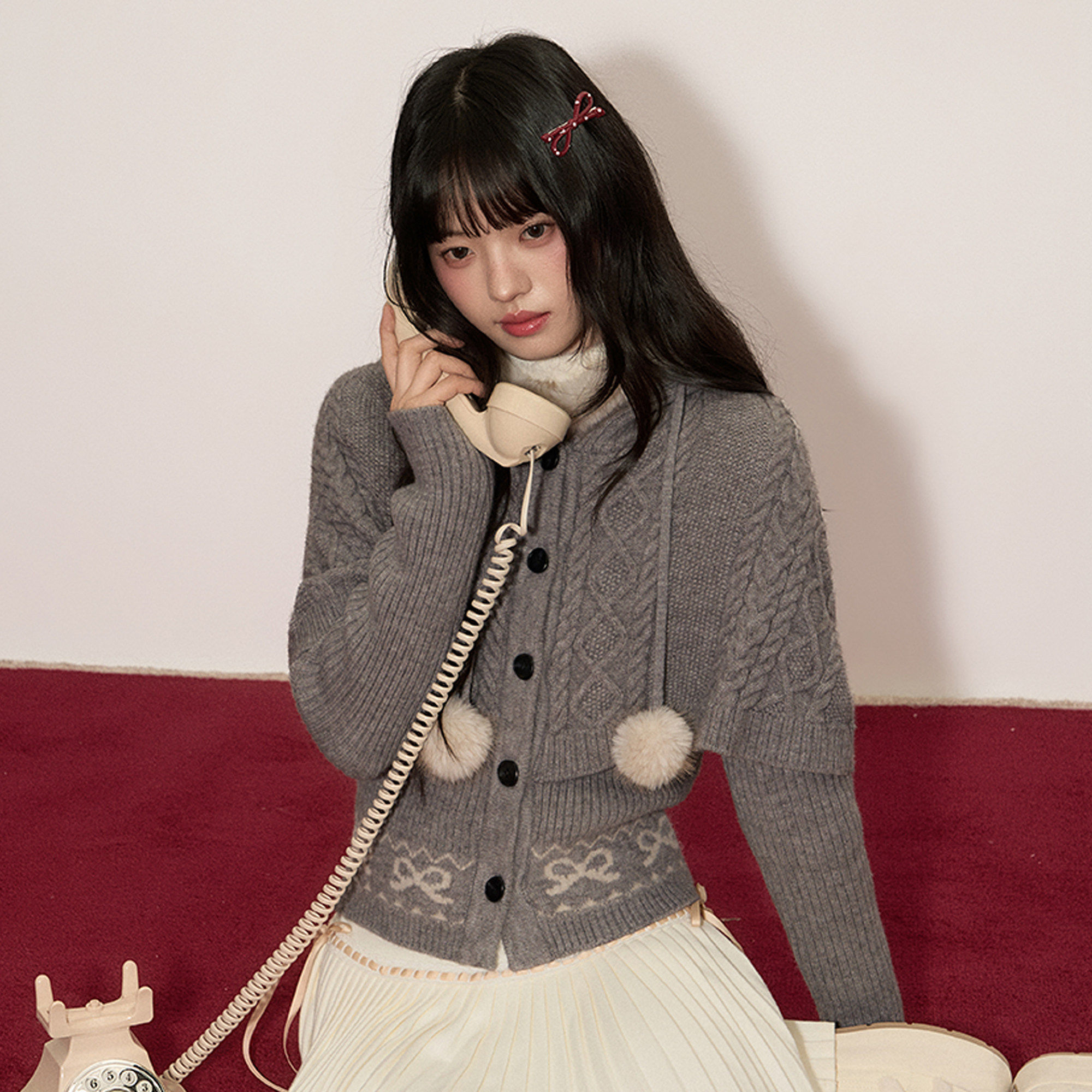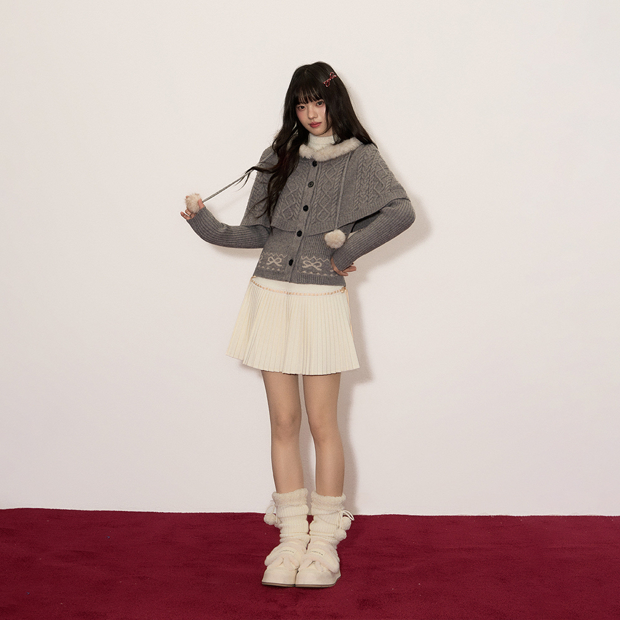 【新年款】umoumo乌蘑甜美毛绒连帽斗篷绞花提花开衫毛衣
