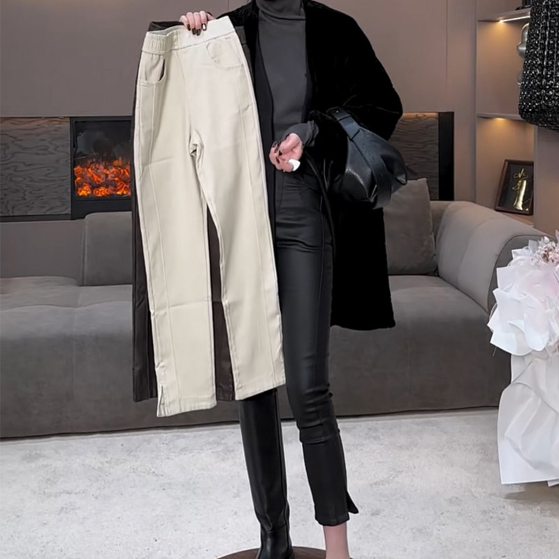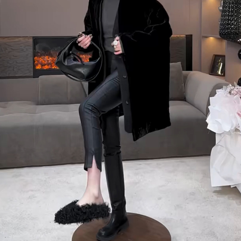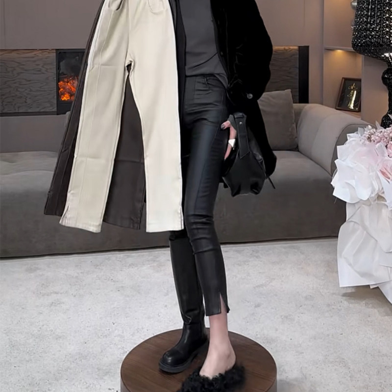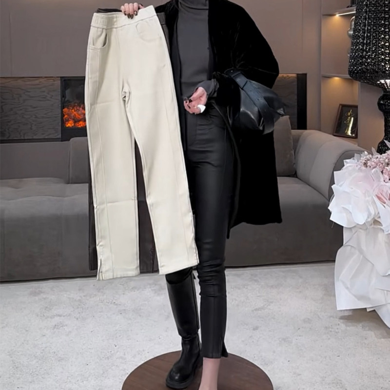 冬季新款加绒涂层裤子女侧开叉九分修身弹力高腰哑光铅笔裤皮裤女