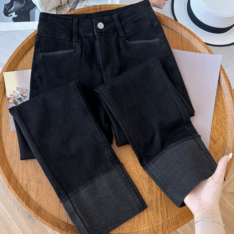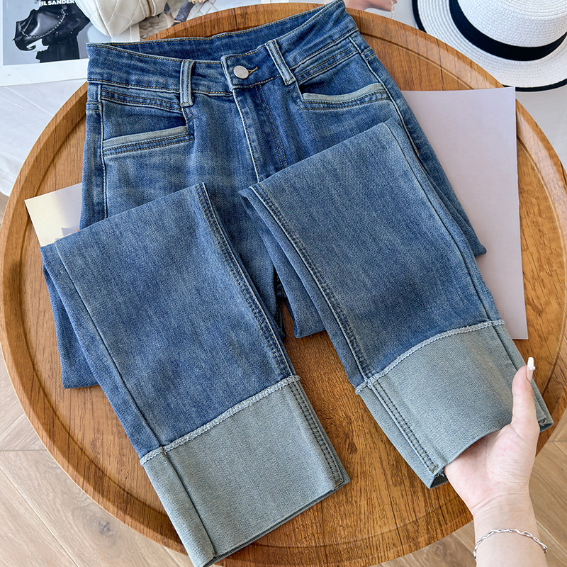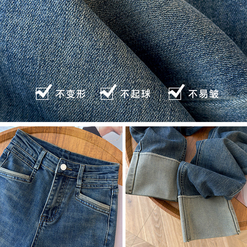 首页> 女装> 啄木鸟复古拼接九分直筒牛仔裤女秋冬季加绒小个子女裤卷边烟管裤