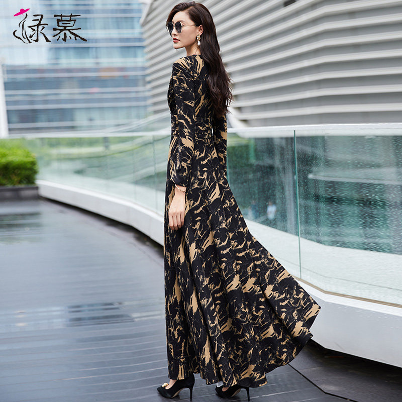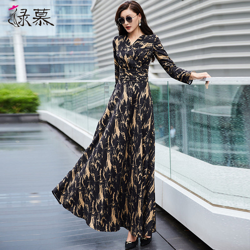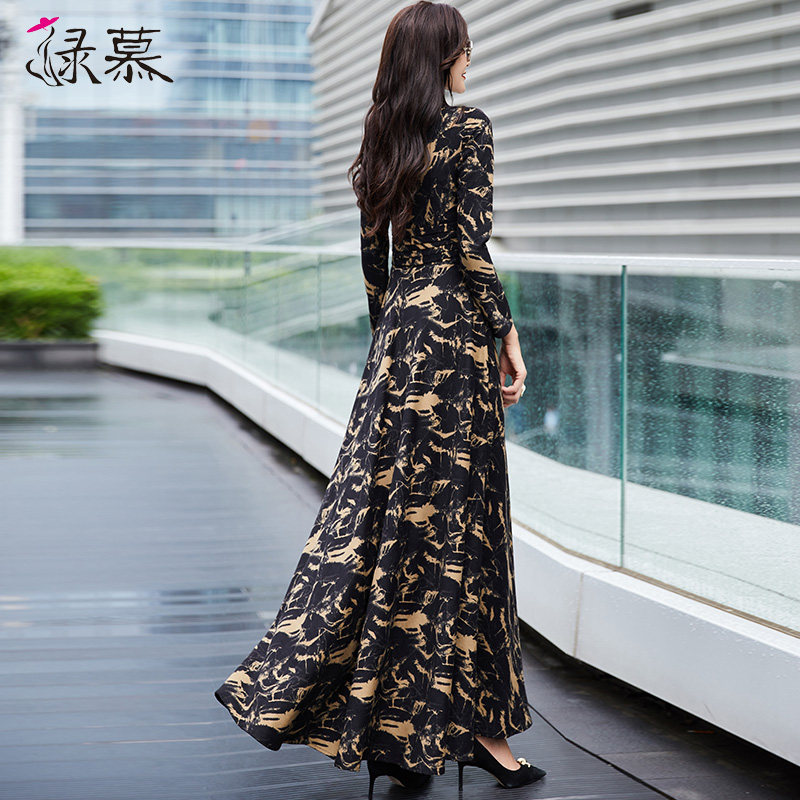 长袖连衣裙女2025春春秋新收腰显瘦长款过膝气质黑色V领大摆长裙