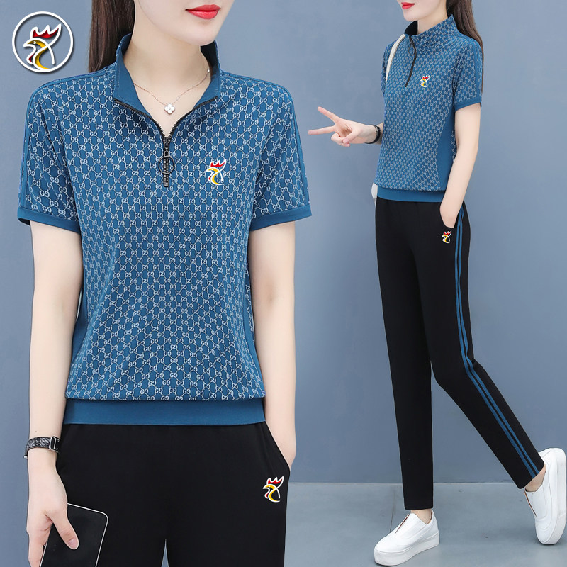【品牌】纯棉运动套装女士夏季新款时尚立领大码跑步休闲服两件套